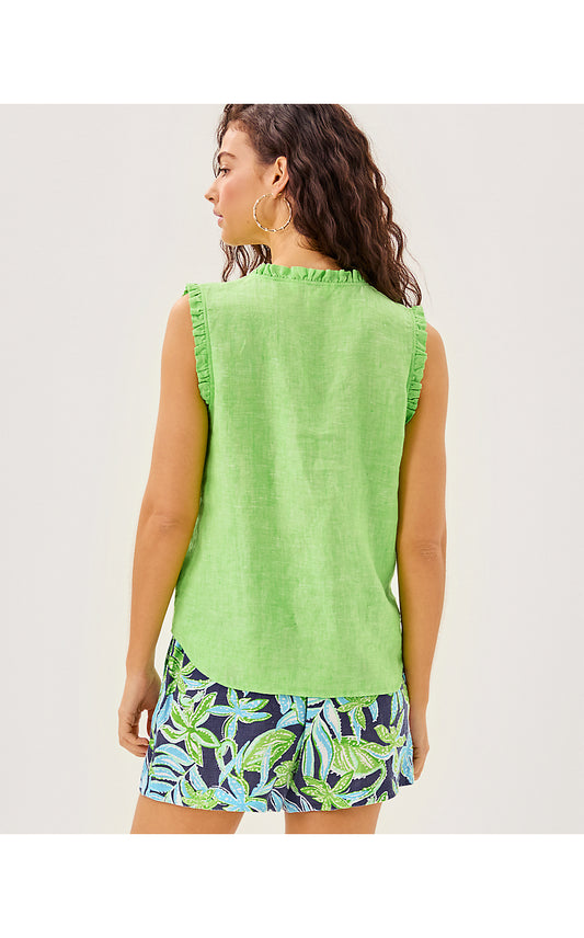 KAVALLA SLEEVELESS RUFFLE TOP, CROCODILE GREEN X RESORT WHITE