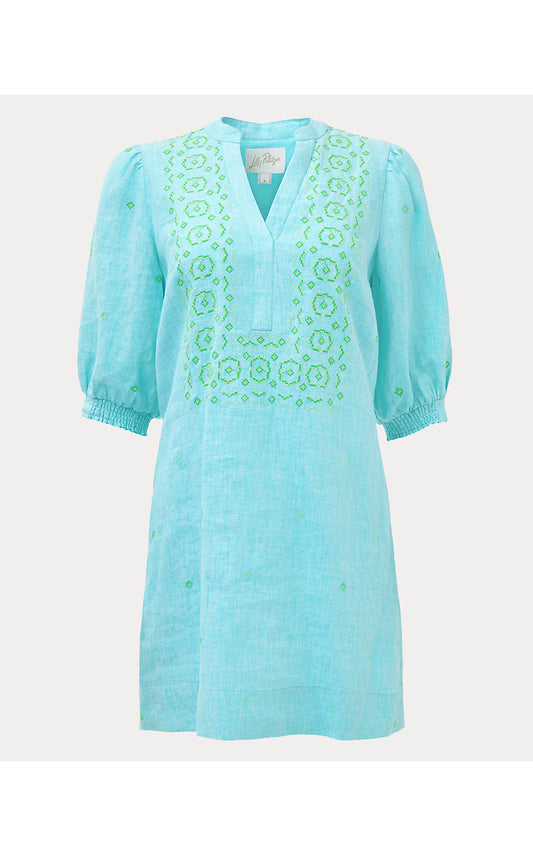 MIALEIGH ELBOW SLEEVE LINEN DRESS, CAPRI BLUE X RESORT WHITE