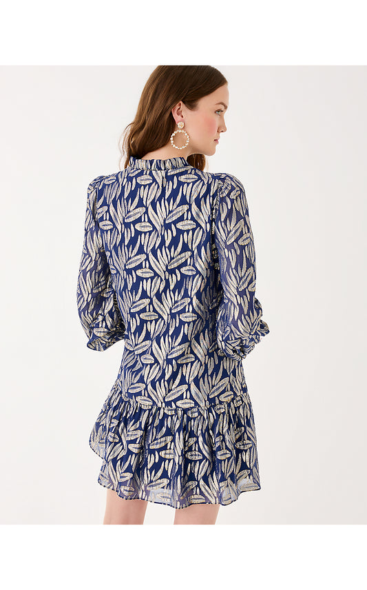 EVALINE SILK DRESS, LOW TIDE NAVY LEAFY BABE METALLIC SILK CLIP