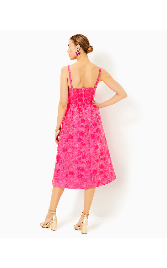 ELLARA JACQUARD MIDI BOW DRESS, PASSION FRUIT PINK LEAF AN IMPRESSION JACQUARD