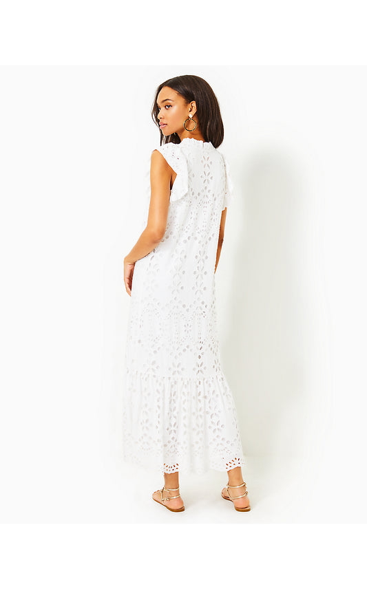 KLAUDIE RUFFLE SLEEVE EYELET MIDI DRESS, RESORT WHITE SOIREE EYELET