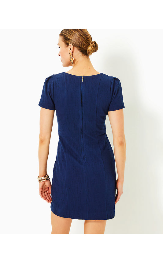 BRINLEY STRETCH SHIFT DRESS, LOW TIDE NAVY WAVY KNIT JACQUARD