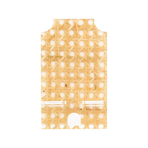 organize your desk and keep your workspace ready for display with an acrylic stand featuring natural caning. it holds your phone upright so you can stay hands-free and has a small opening near the base for your charger to loop through.
