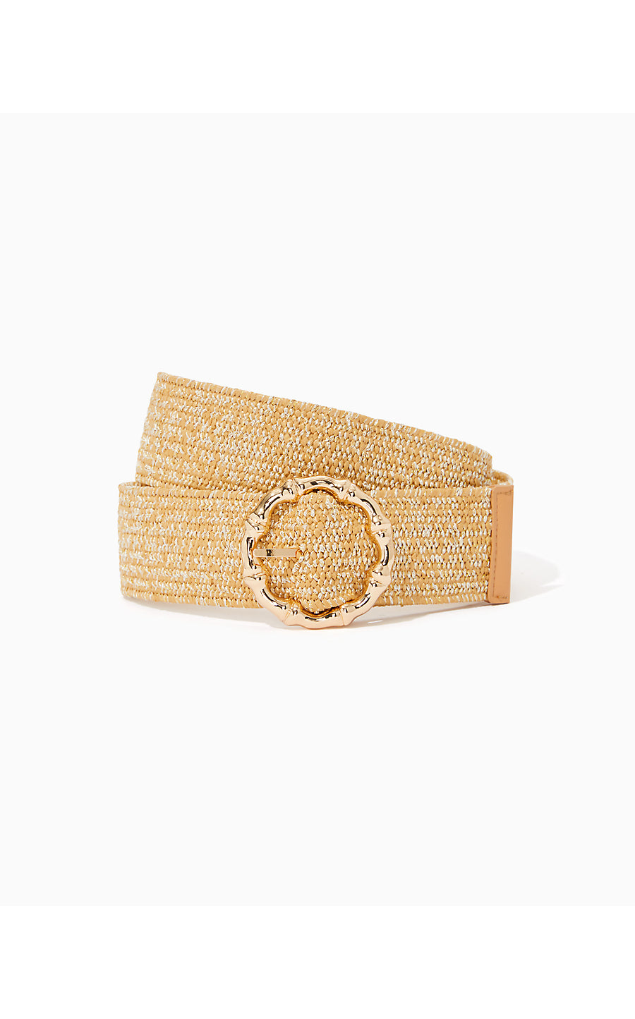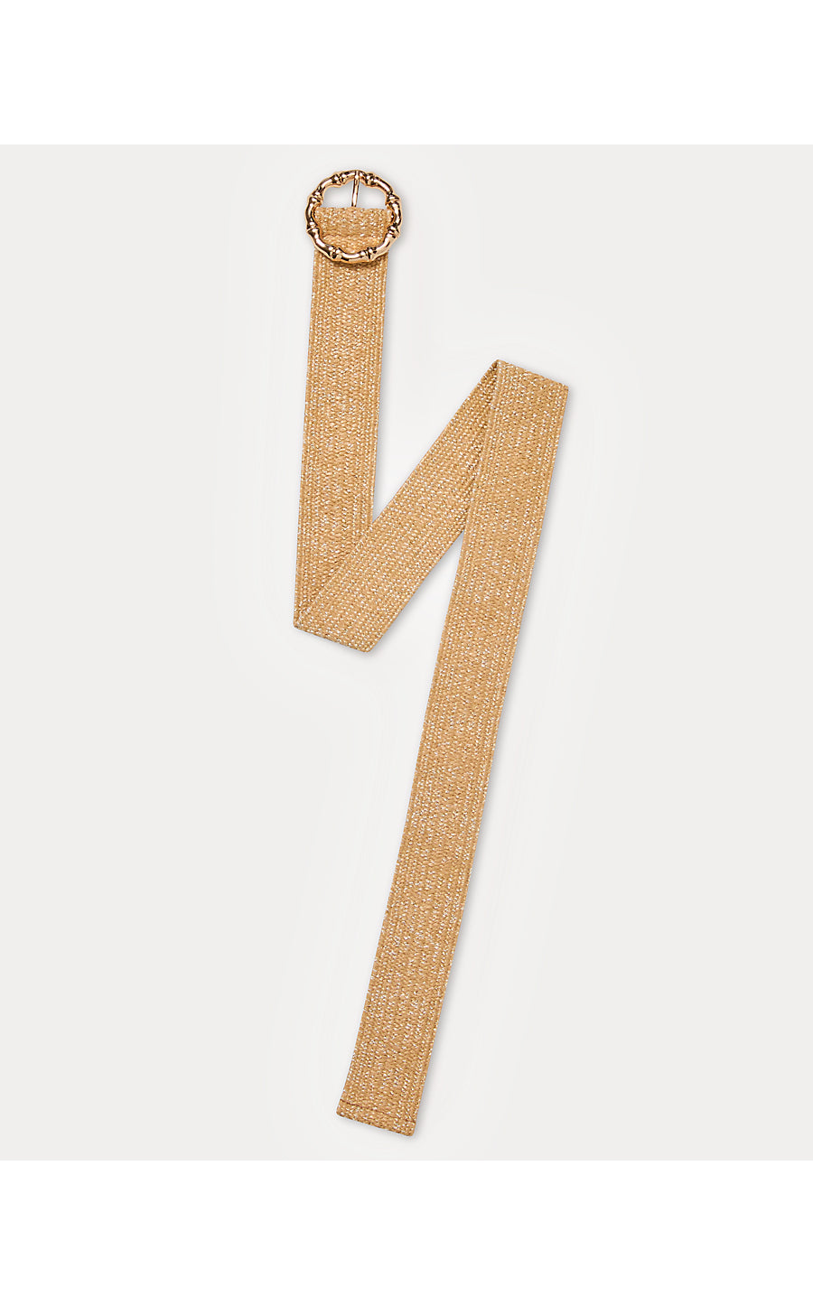 - Stretch raffia belt with a gold metal bamboo closure.