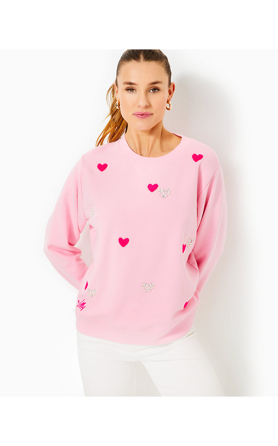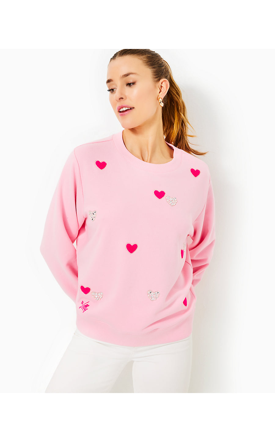 BALLAD LONG SLEEVE SWEATSHIRT, CONCH SHELL PINK HEARTS EMBELLISHMENT