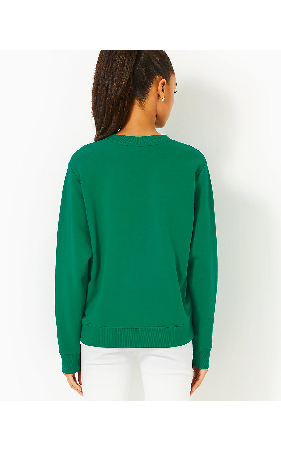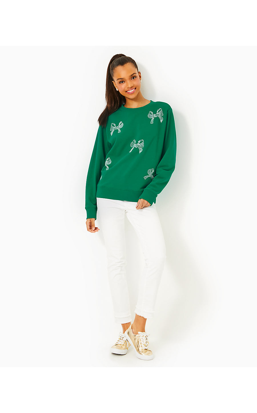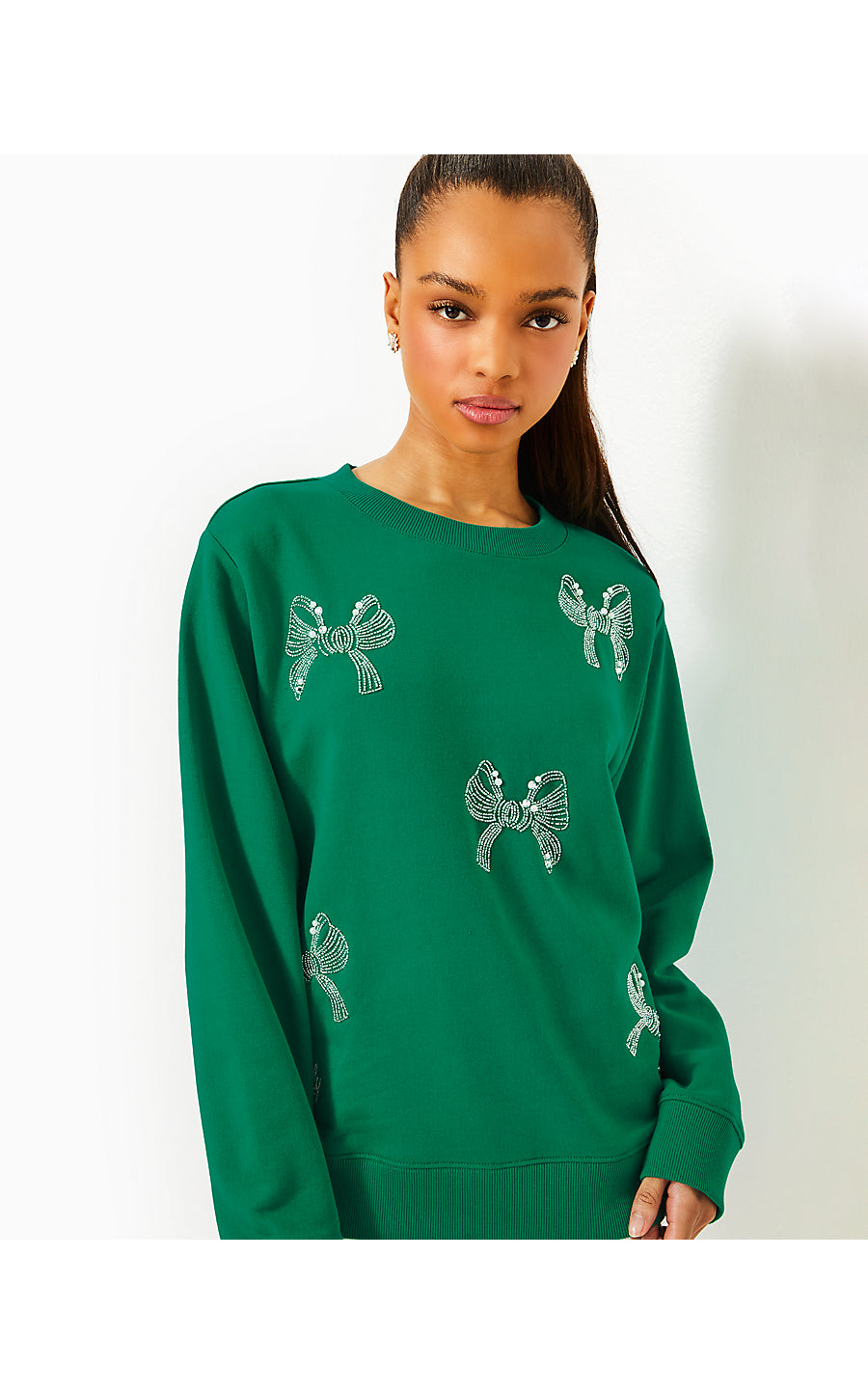 BALLAD LONG SLEEVE SWEATSHIRT, FIDDLE LEAF GREEN BOW EMBELLISHMENT