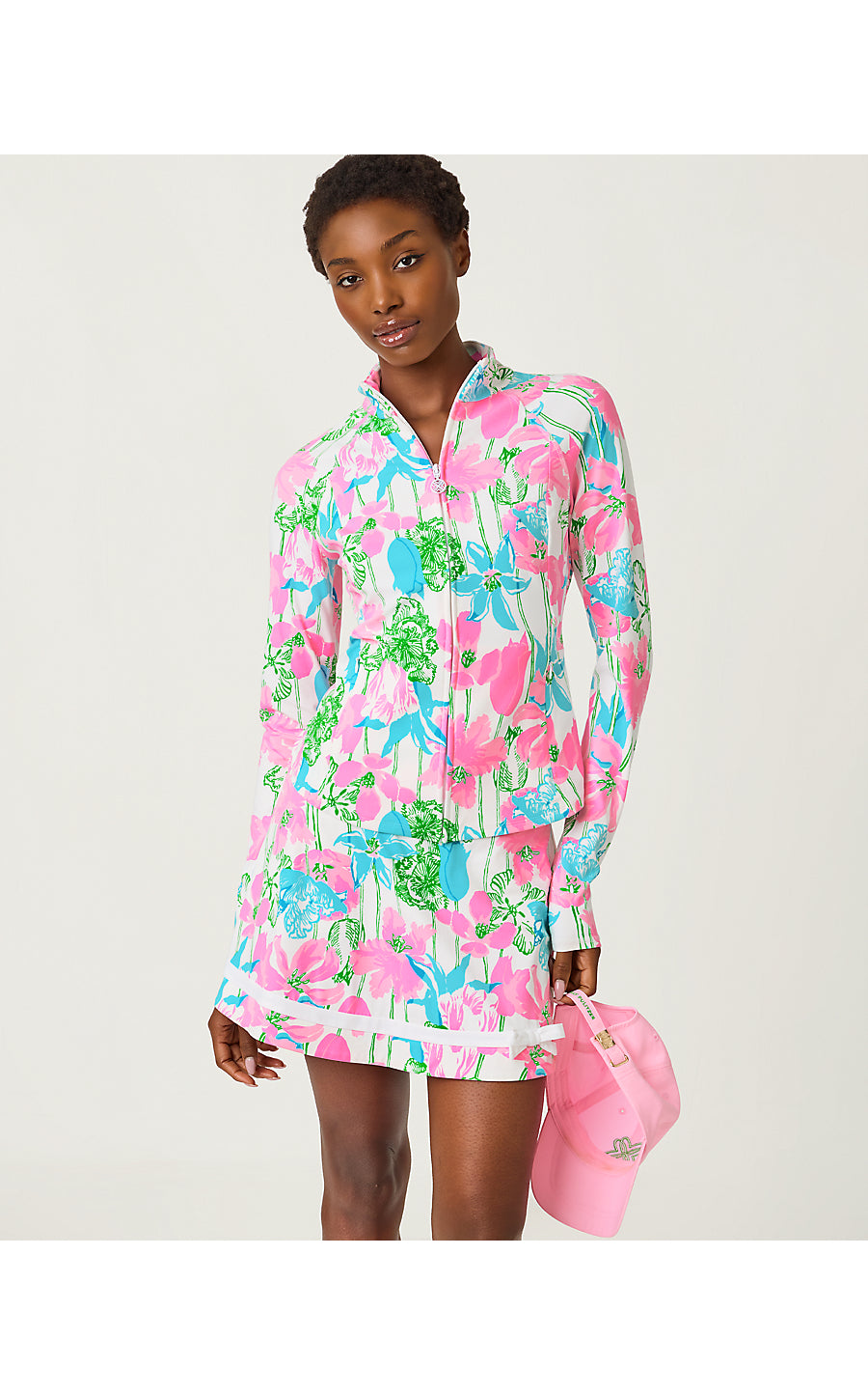 - UPF 50+ Luxletic® full-zip jacket with a rounded hem, thumbholes, and front zipper pockets. Made from moisture wicking, partially recycled material.