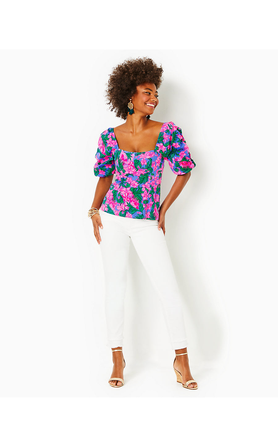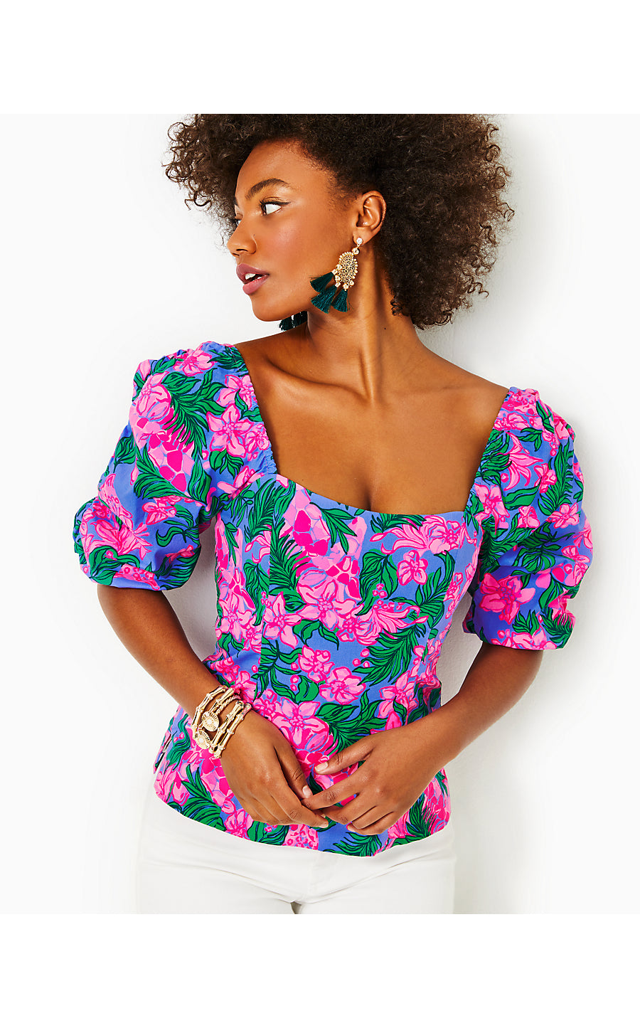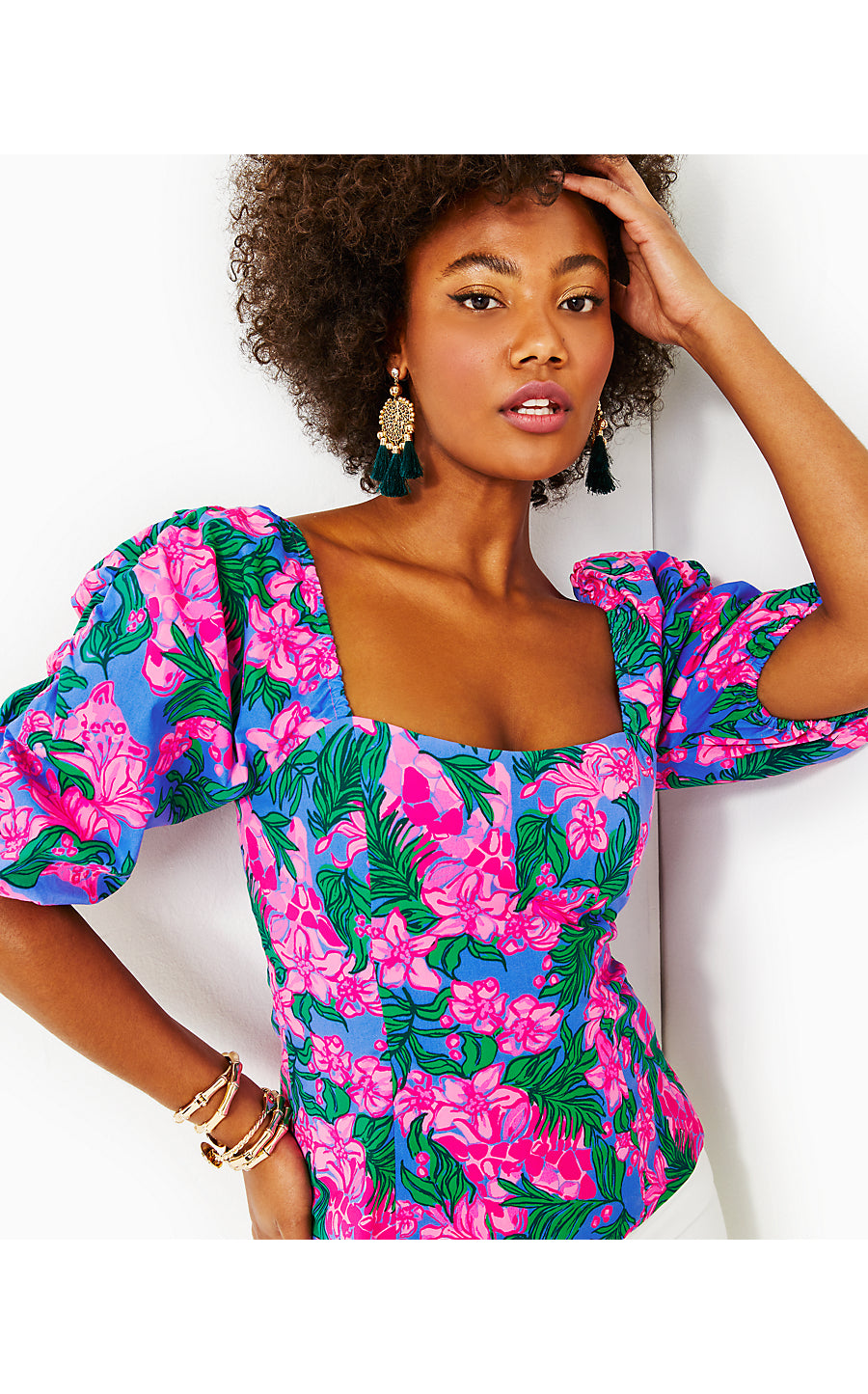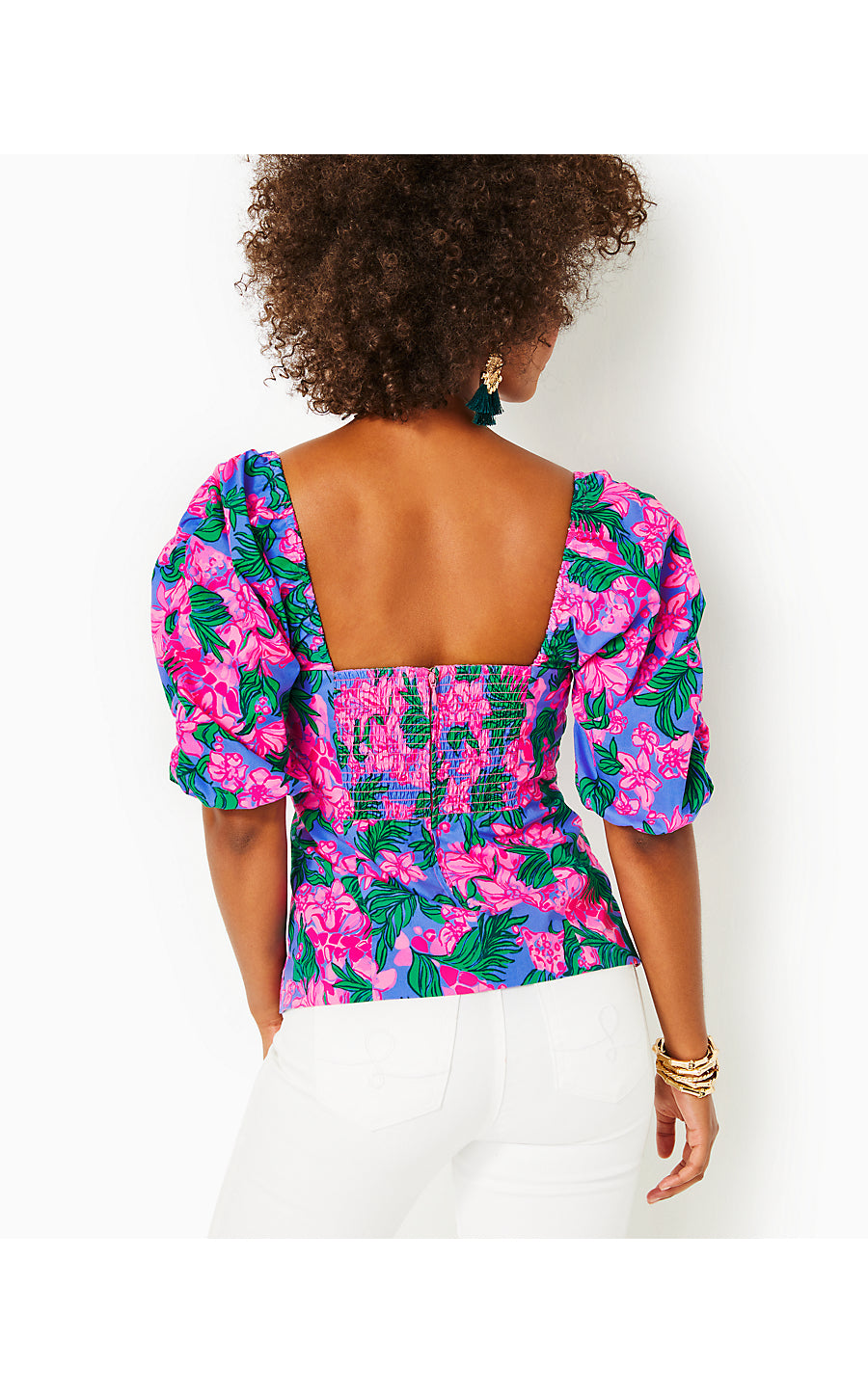 A fitted silhouette and dramatic sleeves make the Bitsy Top the season's ultimate statement separate. Made from printed stretch poplin, this top is completed by a smocked back panel.