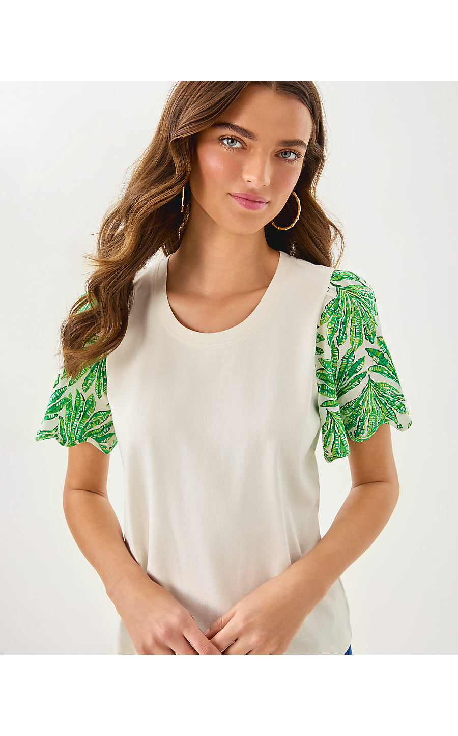 - Straight fit top with a banded crew neckline and woven short sleeves with scalloped edges.