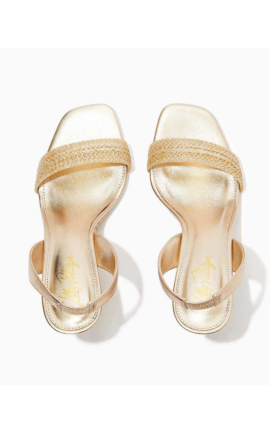 - Metallic straw wedge sandal with a wrapped heel and a plush padded footbed.