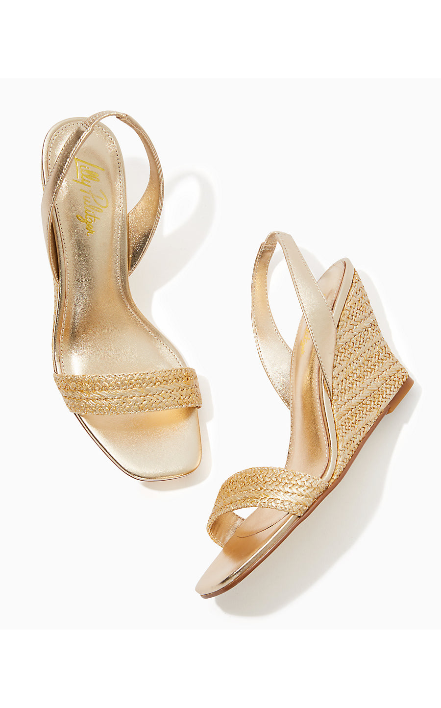 Enjoy chic comfort from day to night in our Carla Wedge, boasting metallic straw construction, a plush padded footbed, and a wrapped heel.