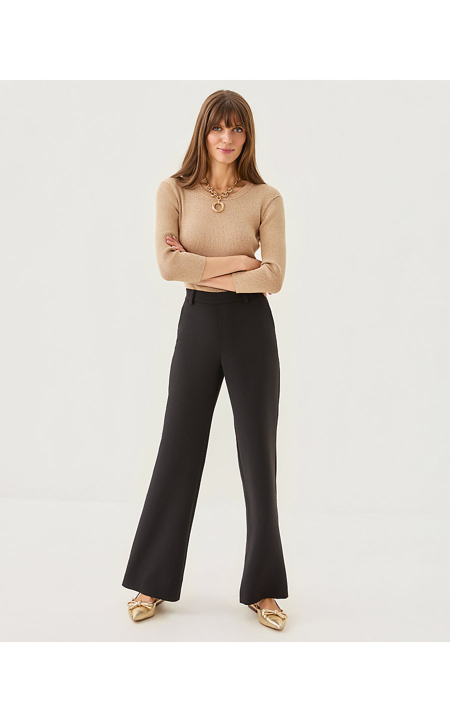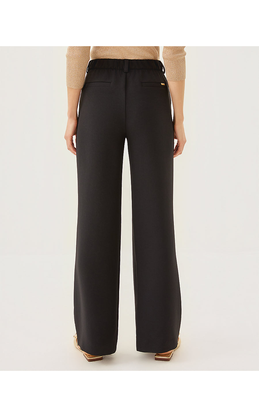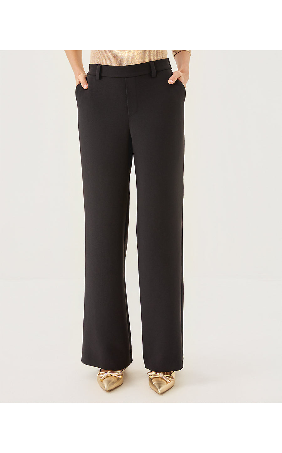 - High rise, pull-on, crepe palazzo pant with a wide fit. Wrinkle resistant.