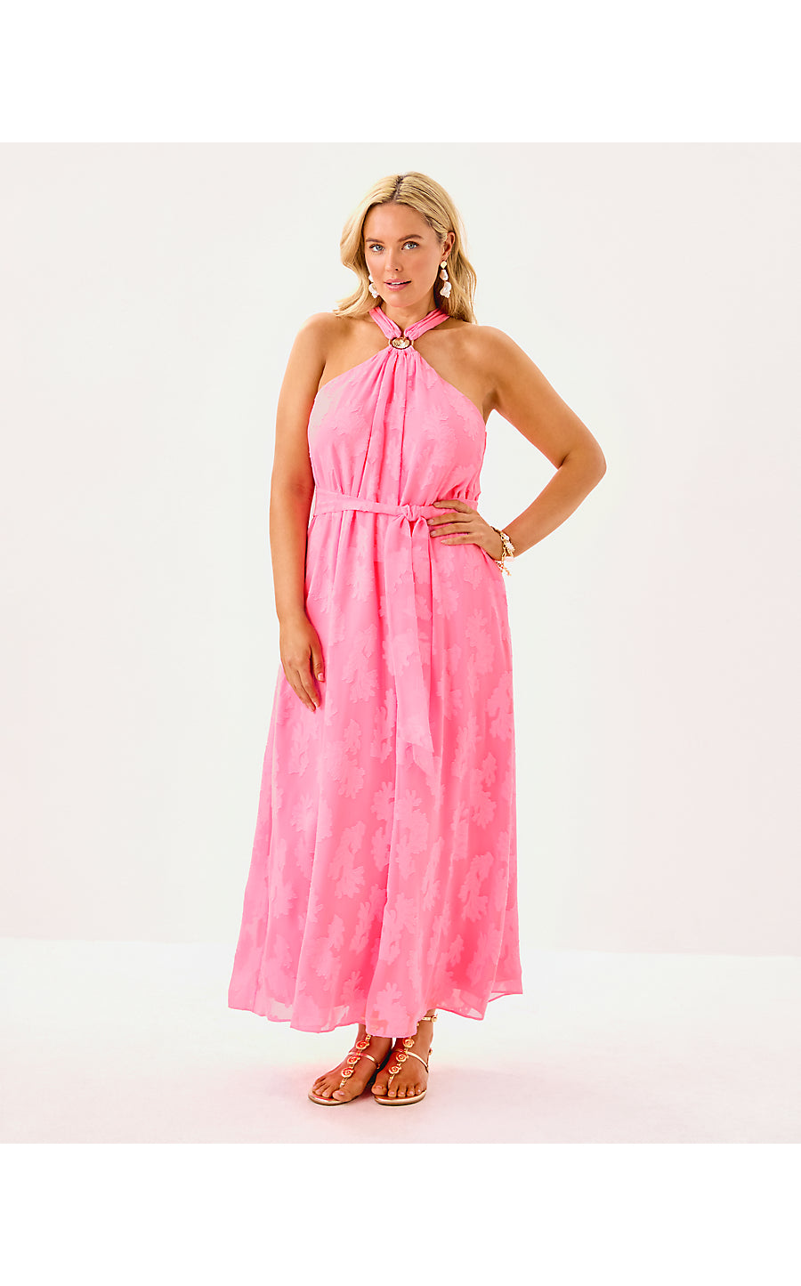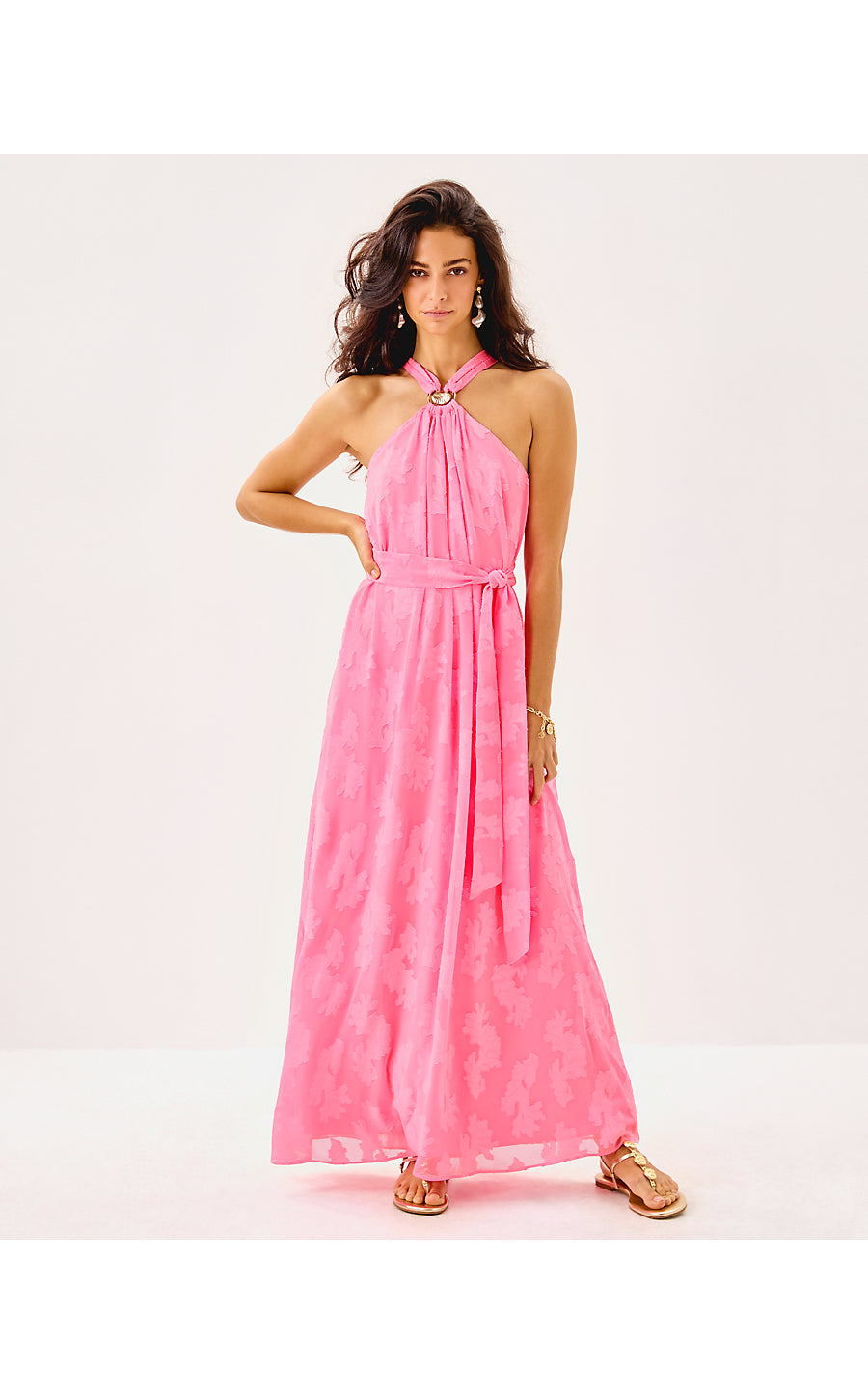 - Swing fit, halter maxi dress with gold shell hardware and a separate sash.