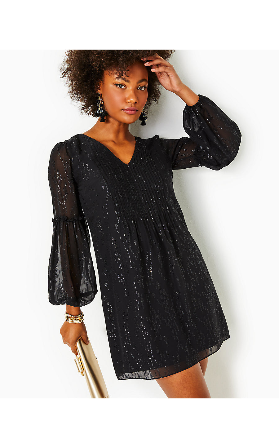 Effortless style meets party-ready glamour in the Cleme Dress. Dusted with metallic details, this silk chiffon dress offers an easy silhouette with full sleeves and a V-neckline trimmed in ruffles and pintucks.