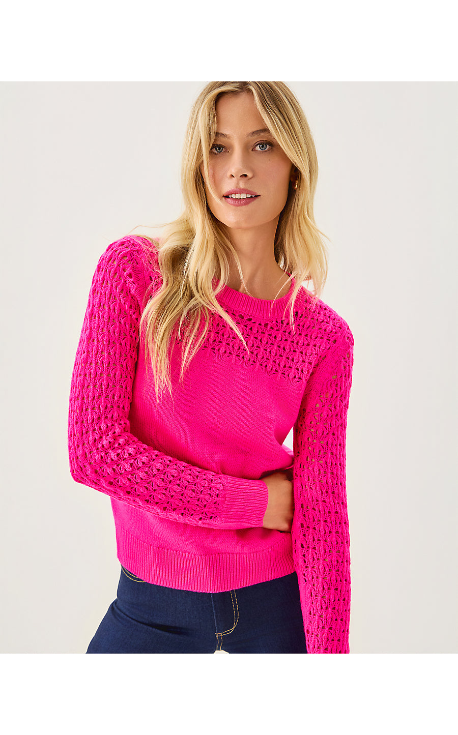 - Straight fit, long sleeve, crew neck pullover with pointelle stitches.