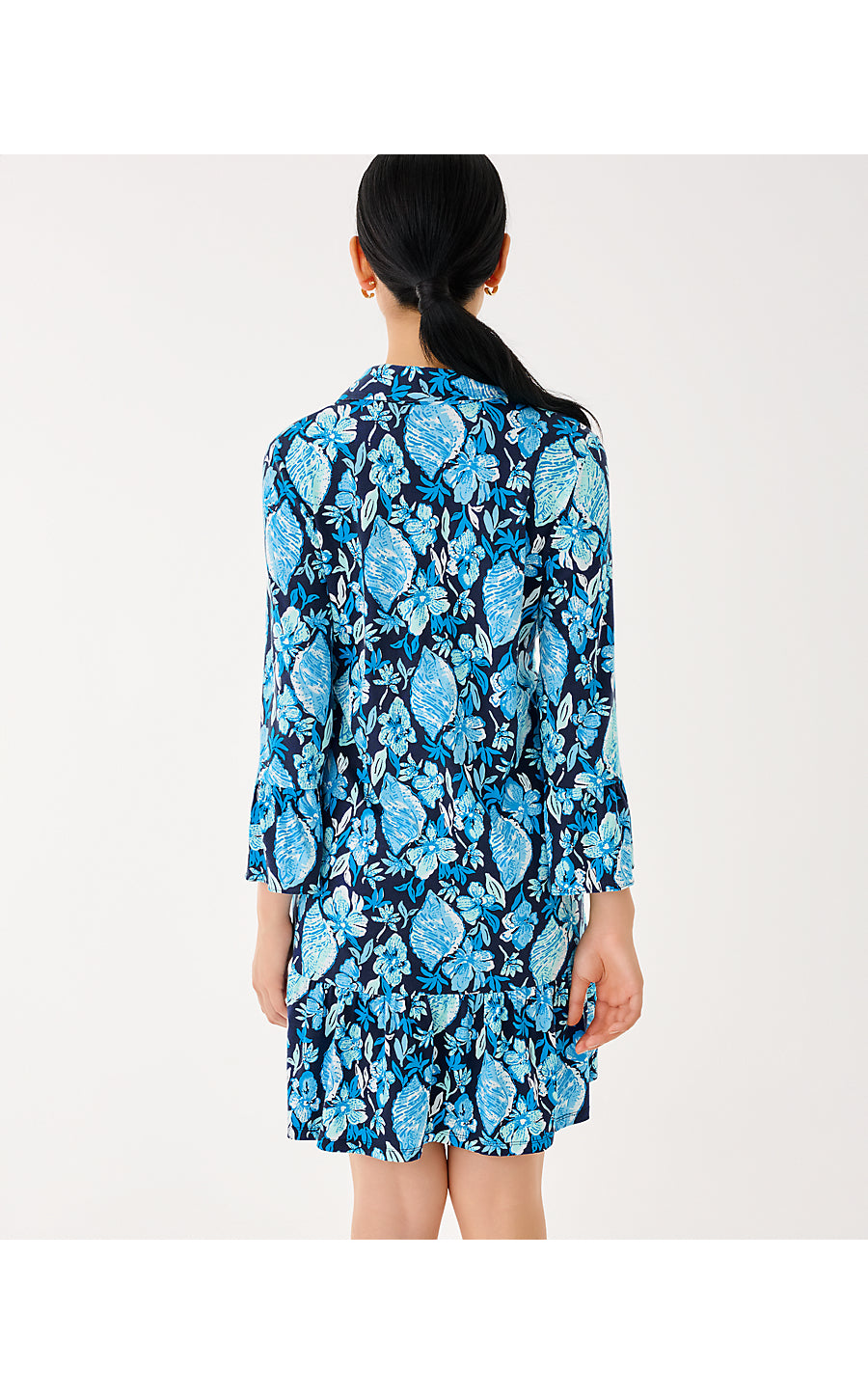 - Swing fit shirtdress with gold buttons, 3/4 length sleeves, and ruffle details.