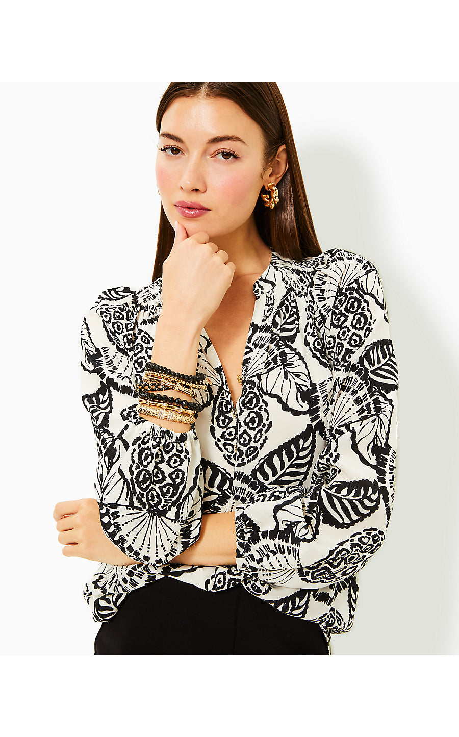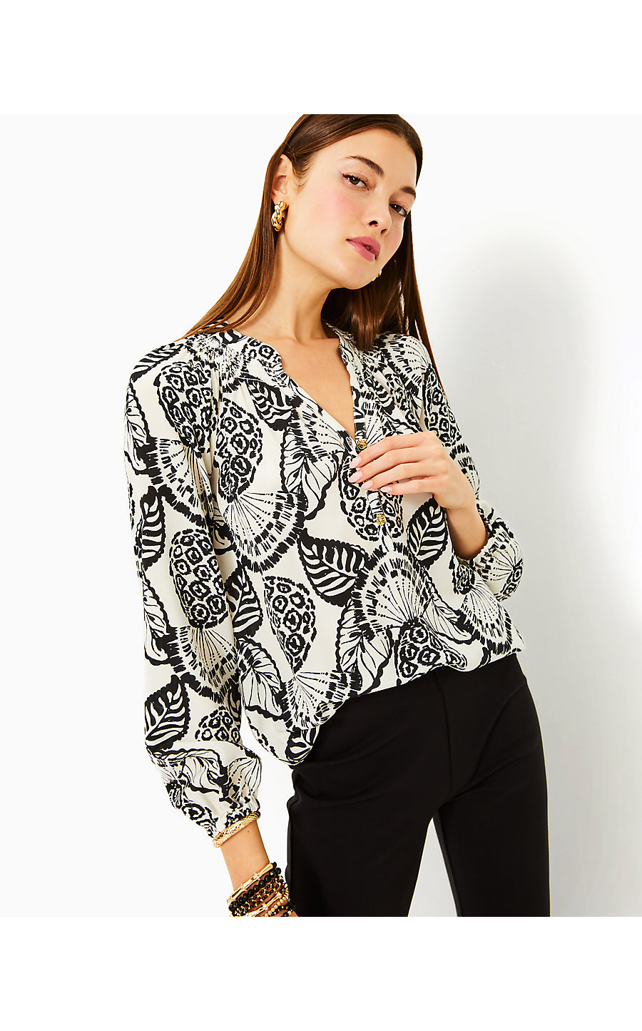 - Easy fit, pullover blouse with gold buttons at the placket and bracelet-length sleeves.