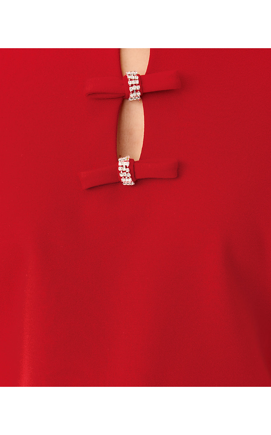- Straight fit top with a front keyhole, puffed sleeves, embellished front bows, and a back zipper.
