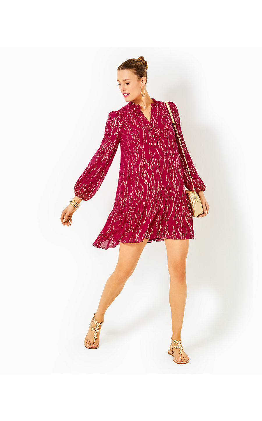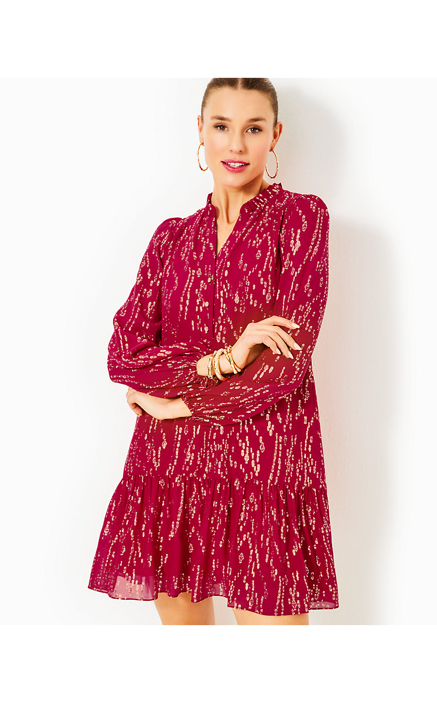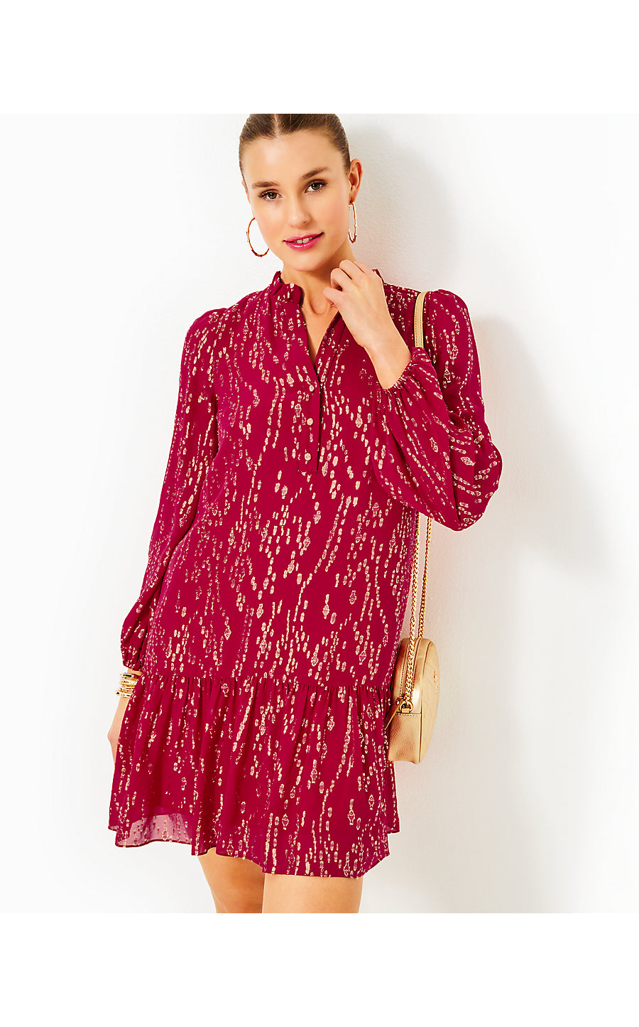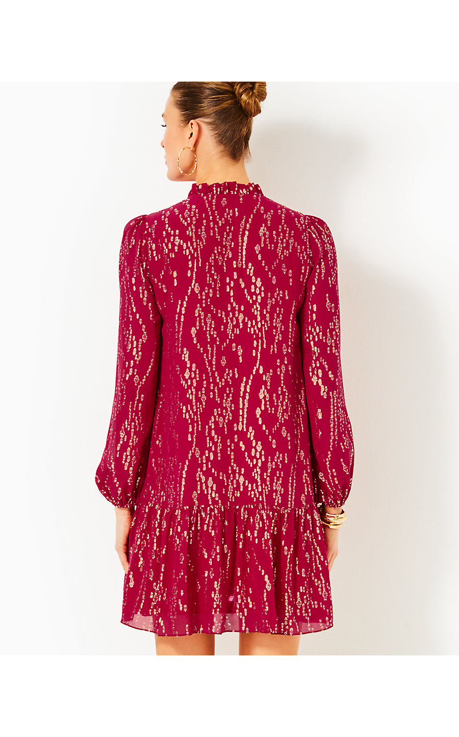 EVALINE SILK DRESS, MALBEC RED FISH CLIP CHIFFON