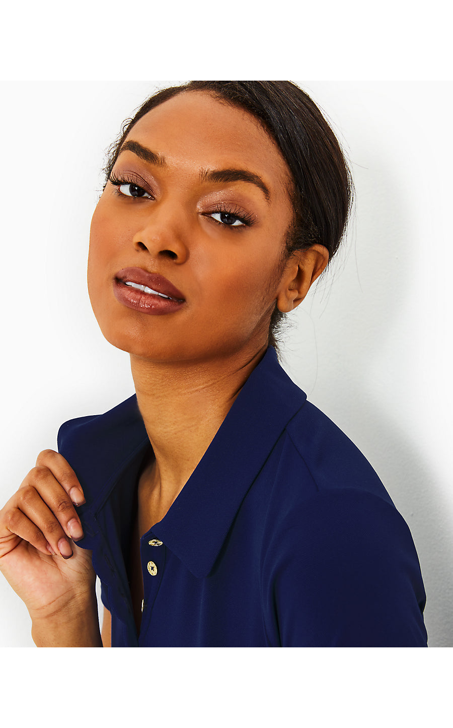We updated our beloved Luxletic Frida Polo Top with a chic new twist: a scalloped placket with gleaming gold buttons! This short sleeve golf top is made from Meryl Nylon Pique fabric that offers practical UPF 50+ sun protection, moisture management, and superior softness.