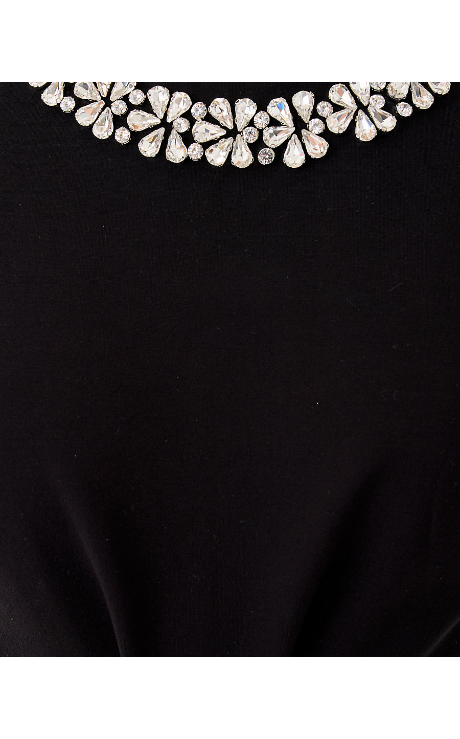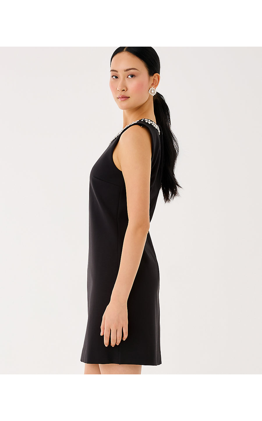 - Fitted shift dress with a rhinestone trim at the front and back neckline.
