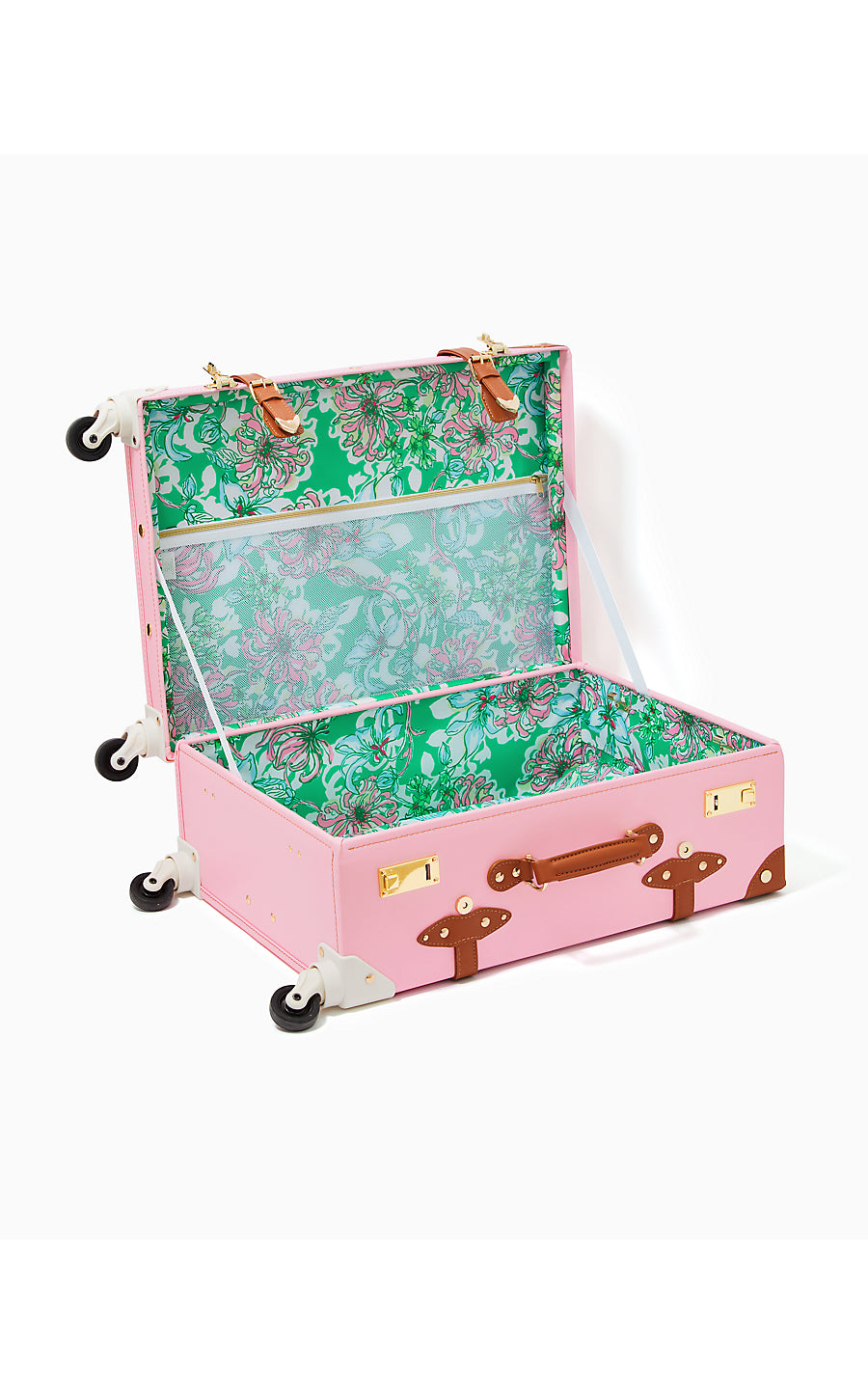 Roll up to your destination in style with this luxe pink suitcase featuring a faux leather trim, printed lining, and gold details.