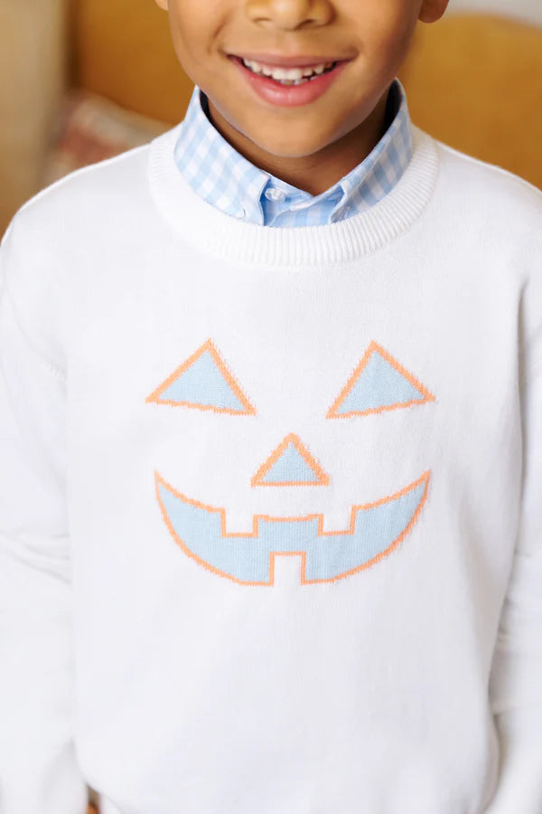Your little gent will look as handsome as can be in this Isaac's Intarsia Sweater. Featuring Palmetto Pearl with Pumpkin Face, this soft sweater is sure to keep him warm and in style!