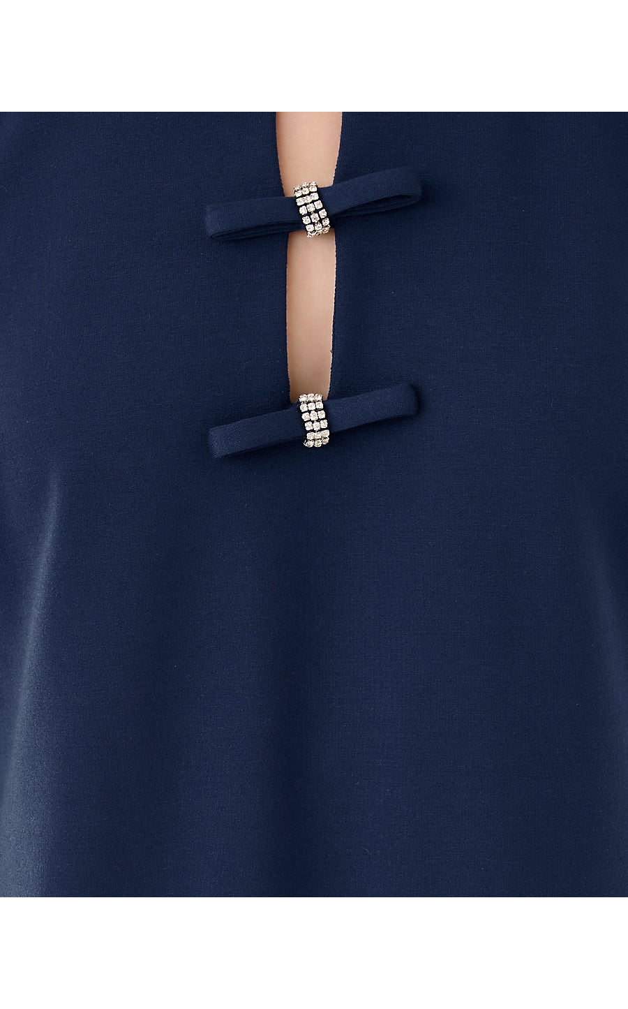 - Straight fit, crew neck shift dress with 3/4 length sleeves and rhinestone bows at the neckline and sleeves.