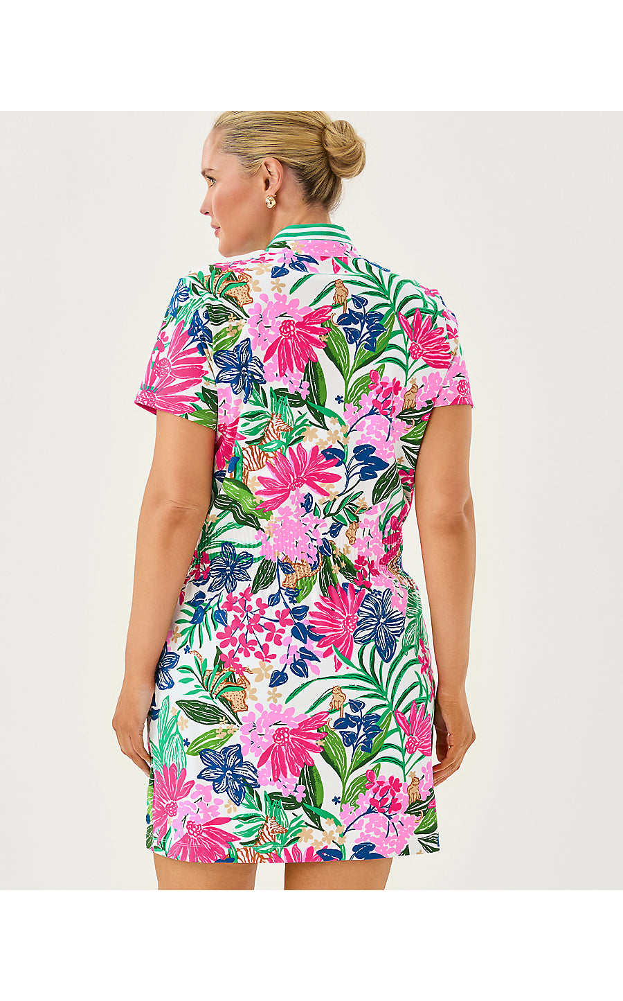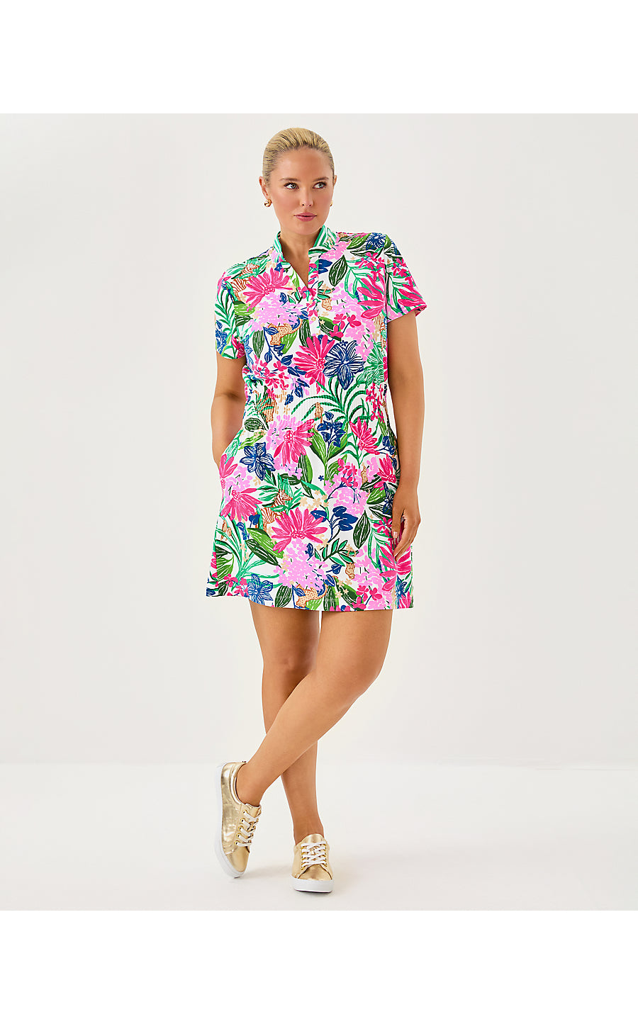 - UPF 50+ Luxletic® active polo dress with a rib collar, gold buttons, smocked waist, and separate undershorts with pockets. Made from moisture wicking, partially recycled material.