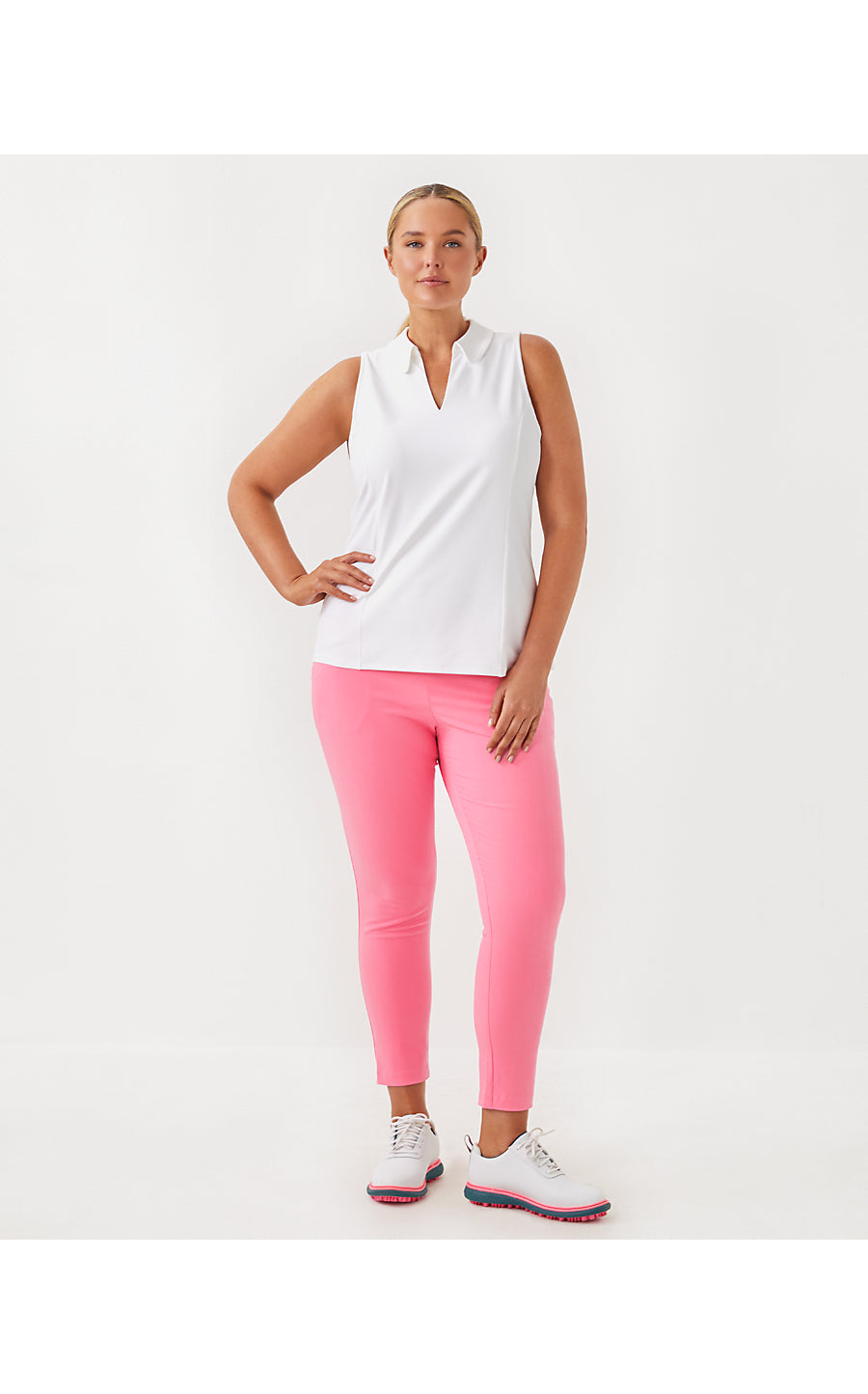 Meet Martina, a classic Meryl® Nylon Pique golf polo shirt with a Lilly twist! With subtle ruffle details, moisture wicking abilities, and UPF 50+ sun protection, this sleeveless style is a high performance addition to your golf wardrobe.