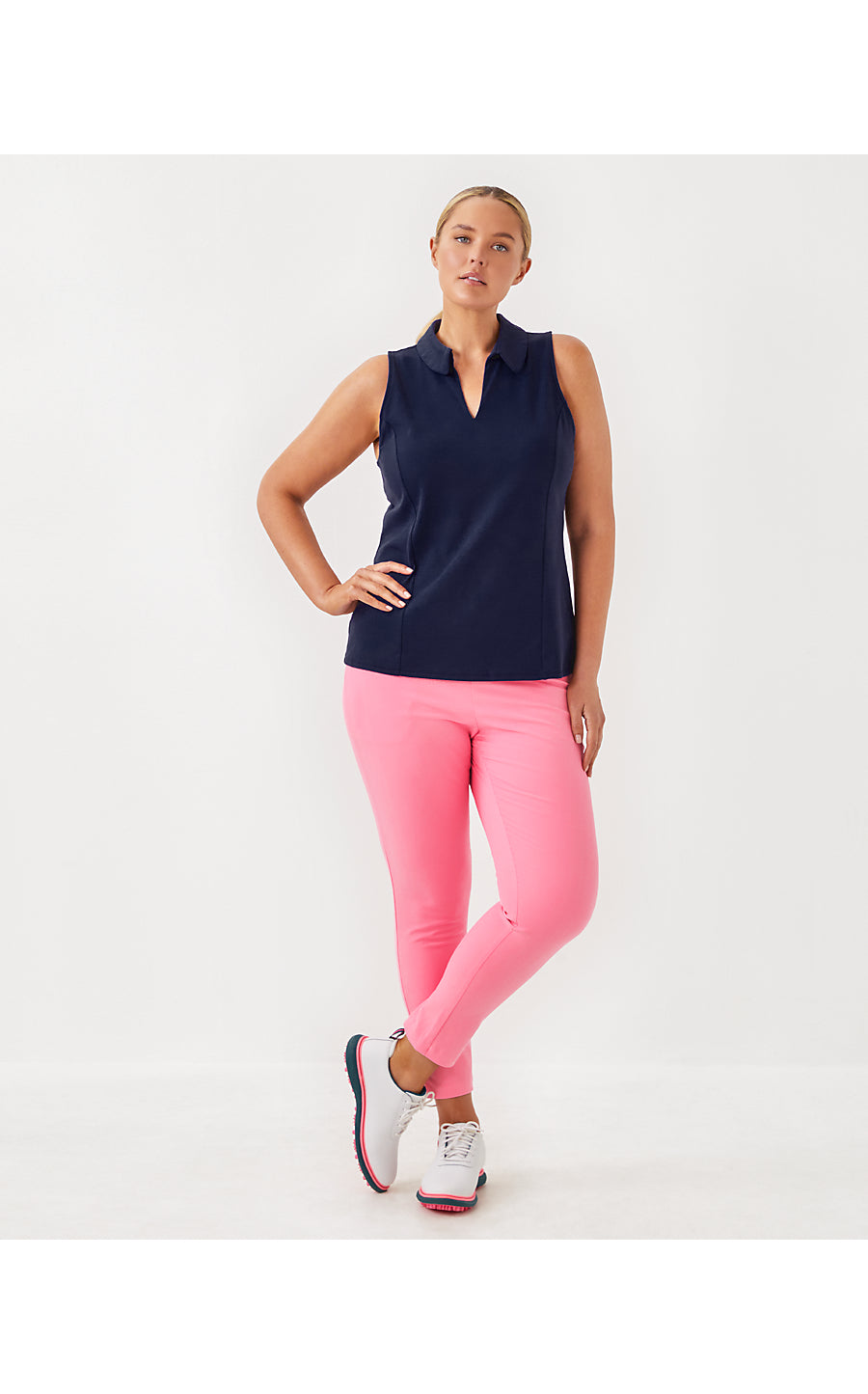 Meet Martina, a classic Meryl® Nylon Pique golf polo shirt with a Lilly twist! With subtle ruffle details, moisture wicking abilities, and UPF 50+ sun protection, this sleeveless style is a high performance addition to your golf wardrobe.