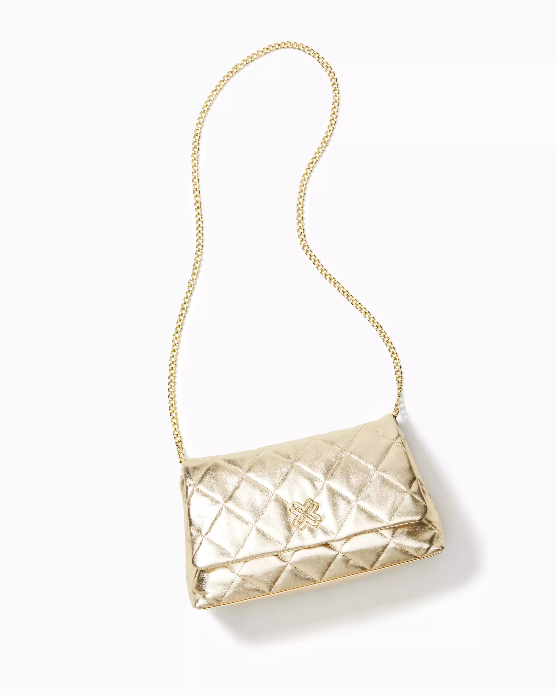 - Quilted leather clutch with a fold-over flap, gold metal logo detail, and detachable gold metal chain strap.