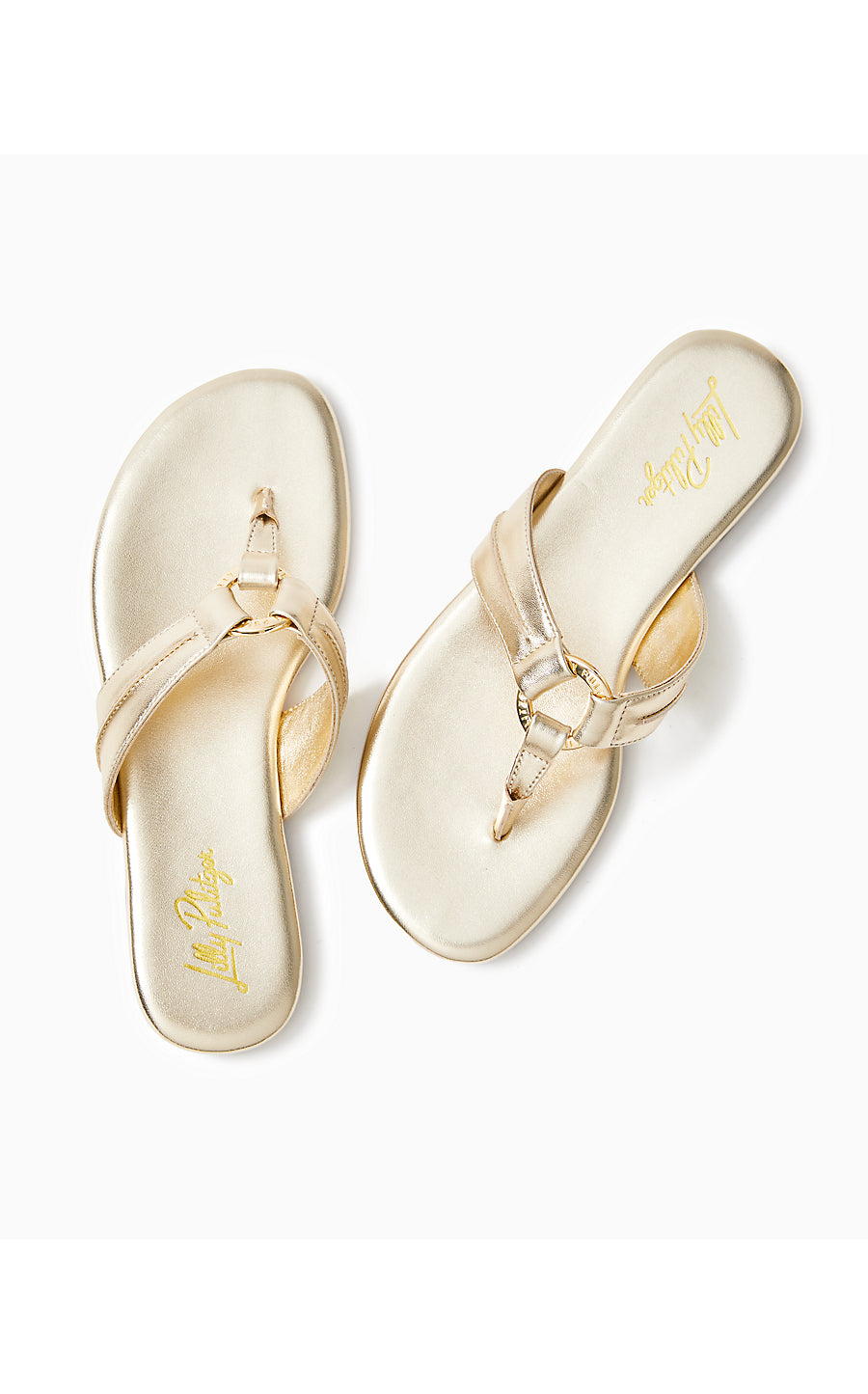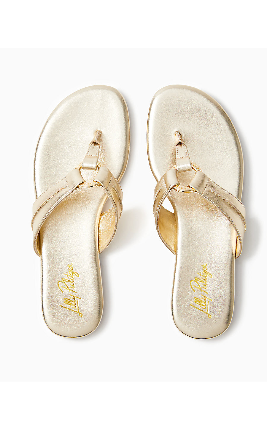 - Nappa perlato leather sandal with signature metal o-ring, vachetta footbed and rubber outsole.