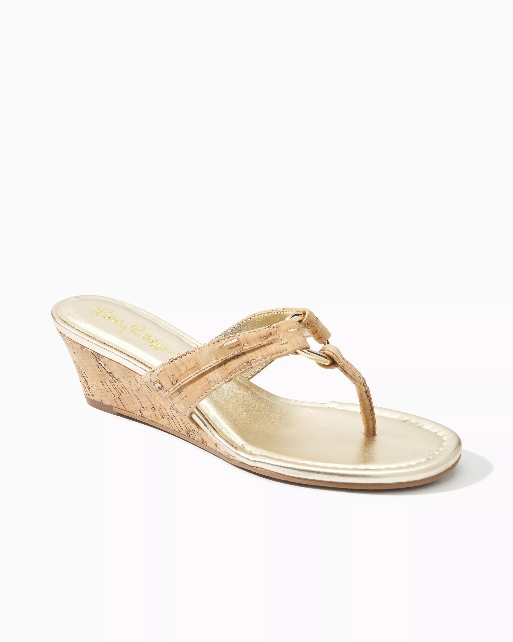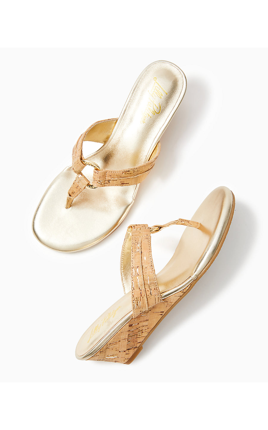 - Gold metallic flecked cork thong sandal with signature metal o-ring and cork-wrapped wedge heel.