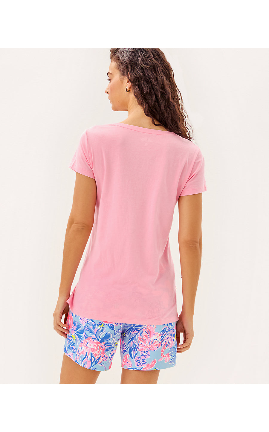 - Straight fit, short sleeve, pullover tee with a V-neckline.