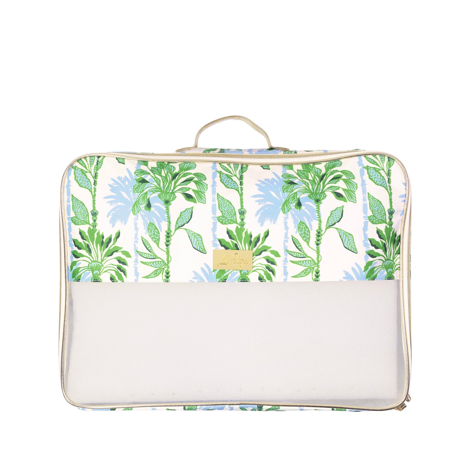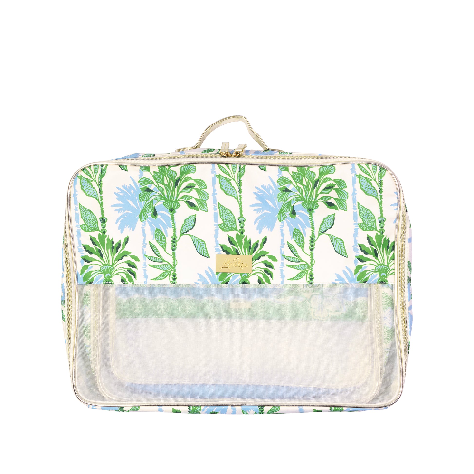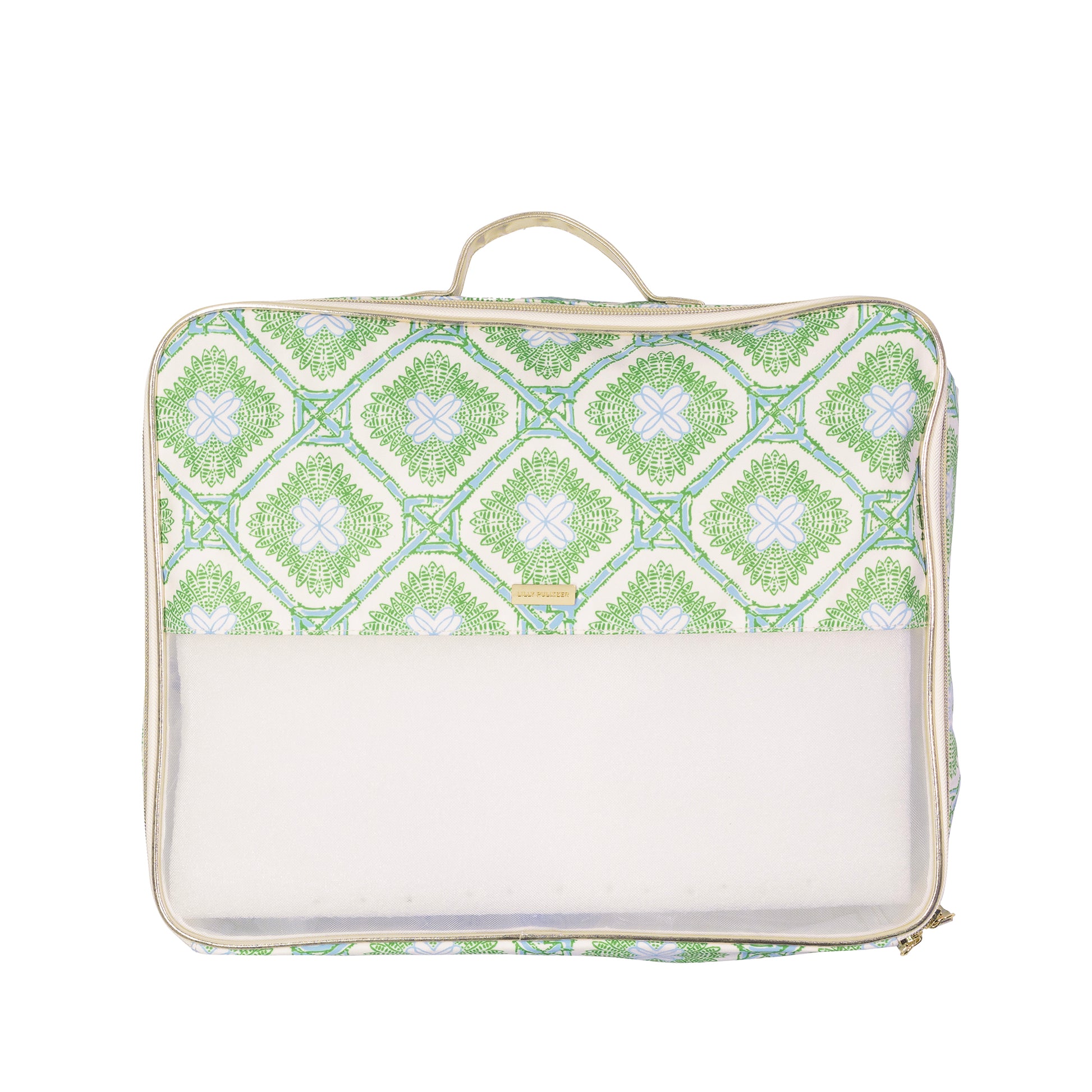 Get ready to jet set with this set of 3 packing cube organizers with a Swayin in the Breeze pattern and gold trim. This set of packing organizers comes in 3 different sizes, is made of nylon, and features mesh windows, leatherette zipper pulls, gold logo emblems, and carrying handles.