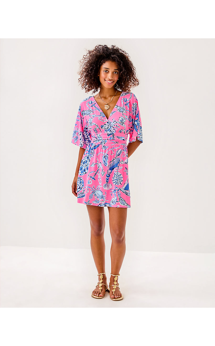 - Skirted romper with a surplice neckline, elbow-length kimono sleeves, and a ruched waistband.