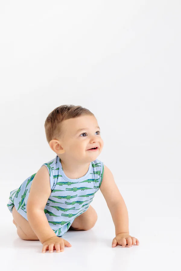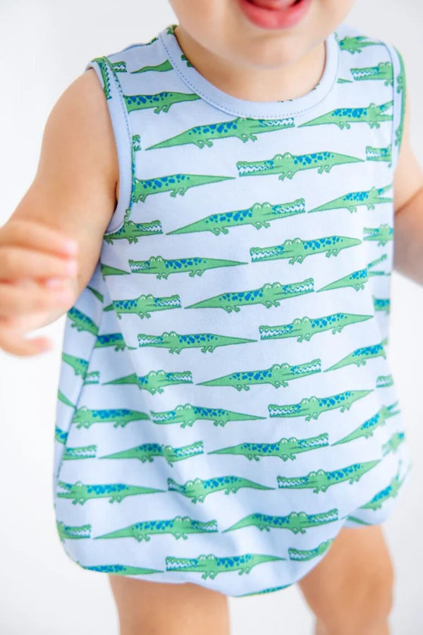Watch your little one explore in style with our Patton Play Bubble showcasing the charming See Ya Later Alligator print in a sweet bubble silhouette. Perfect for active days filled with play, this comfortable one-piece offers easy movement and effortless dressing for busy mornings and spontaneous adventures. An adorable wardrobe staple that brings personality and polish to every moment, from birthday parties to backyard fun.