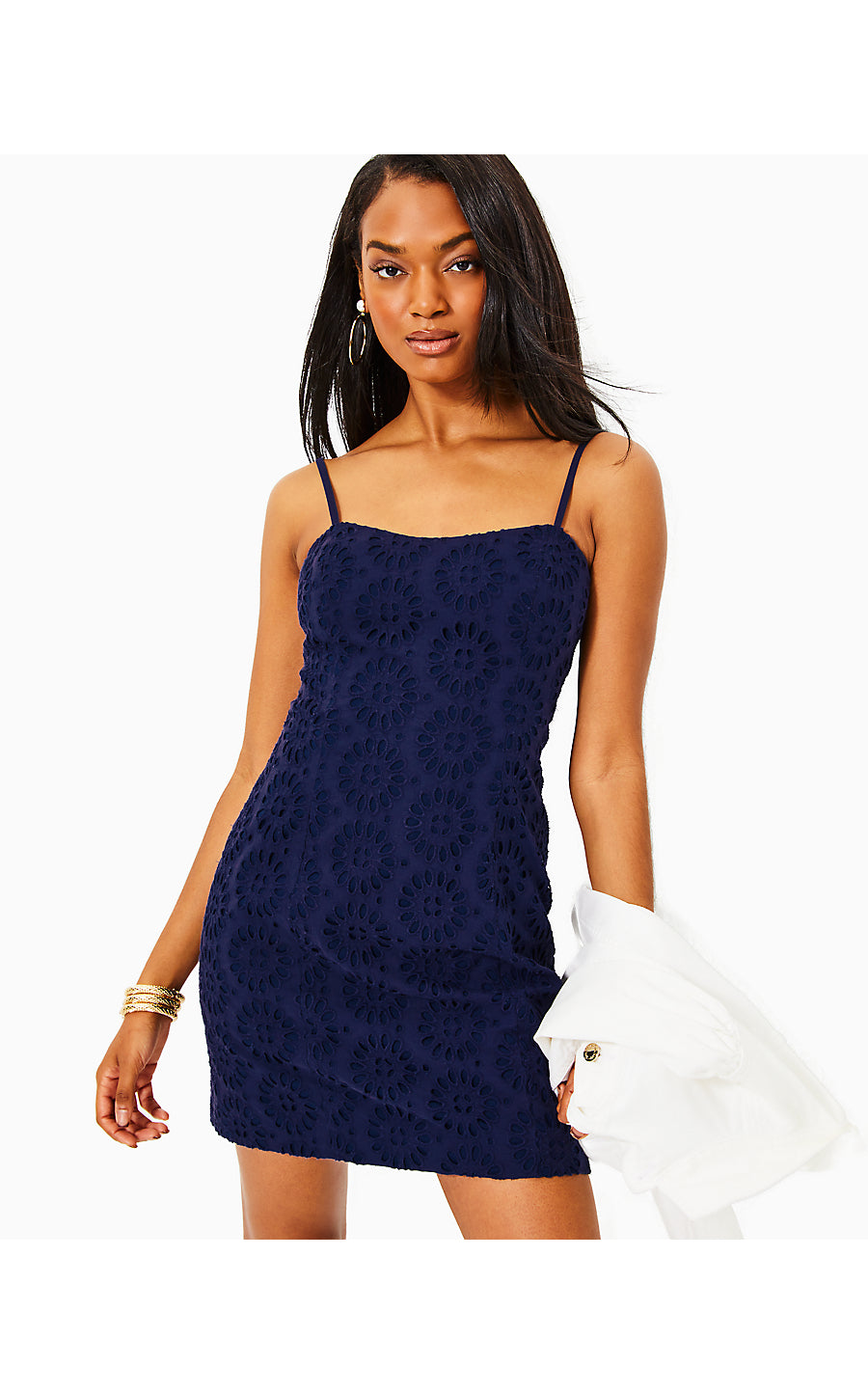 SHELLI DRESS, TRUE NAVY OVERSIZED PINWHEEL EYELET