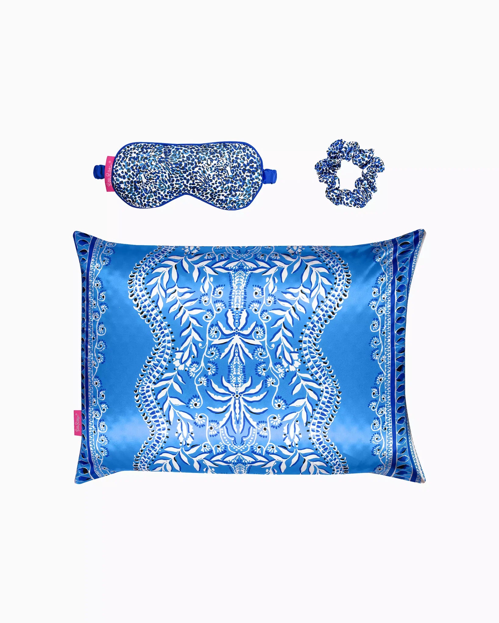 Self-care has never looked so stylish! Feel refreshed and restored after a good night's sleep with this three-piece set, which includes a soft satin pillowcase, eye mask, and scrunchie in a vibrant Lilly print.