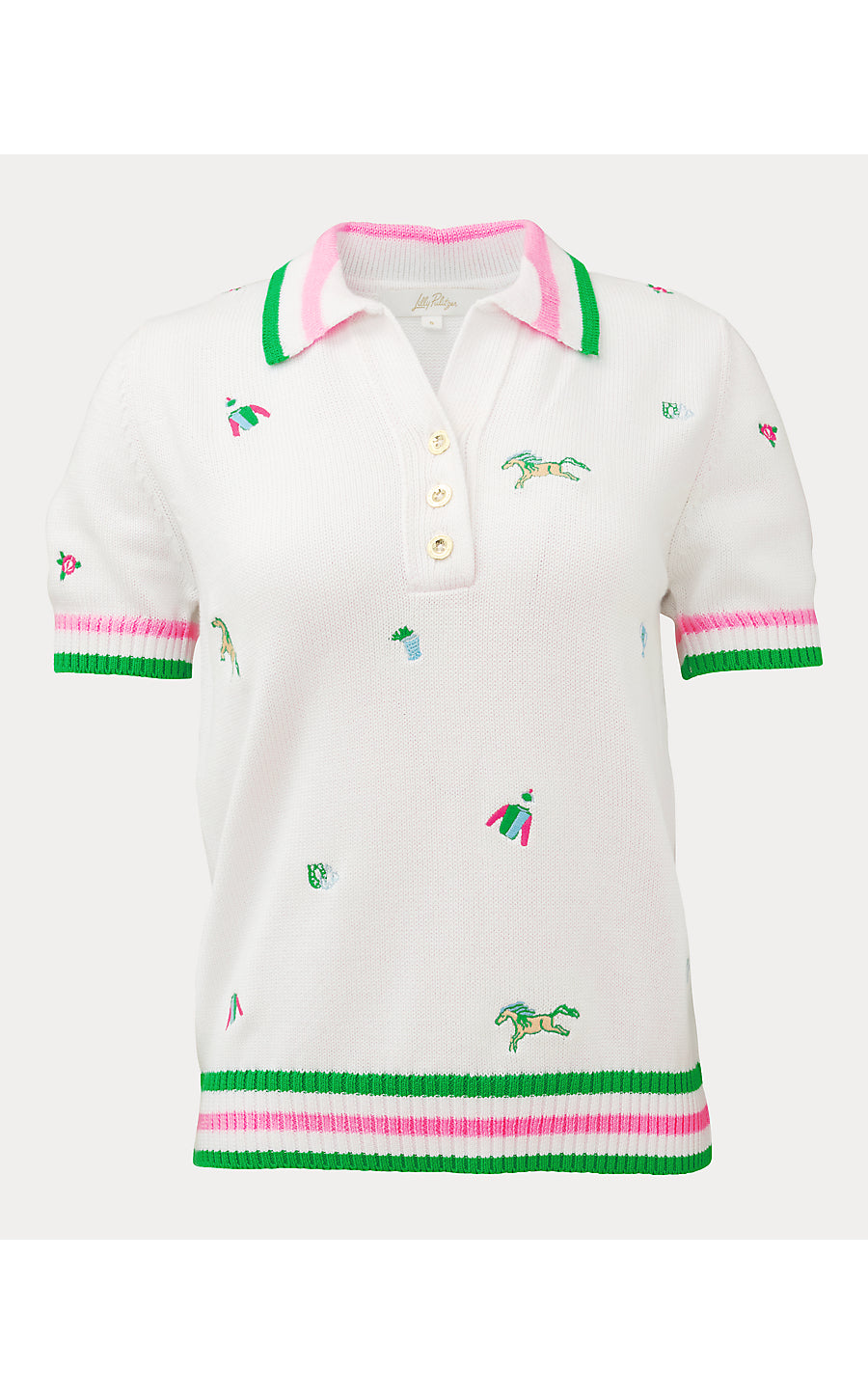 - Straight fit, short sleeve, sweater polo with buttons and tossed embroidery motifs.