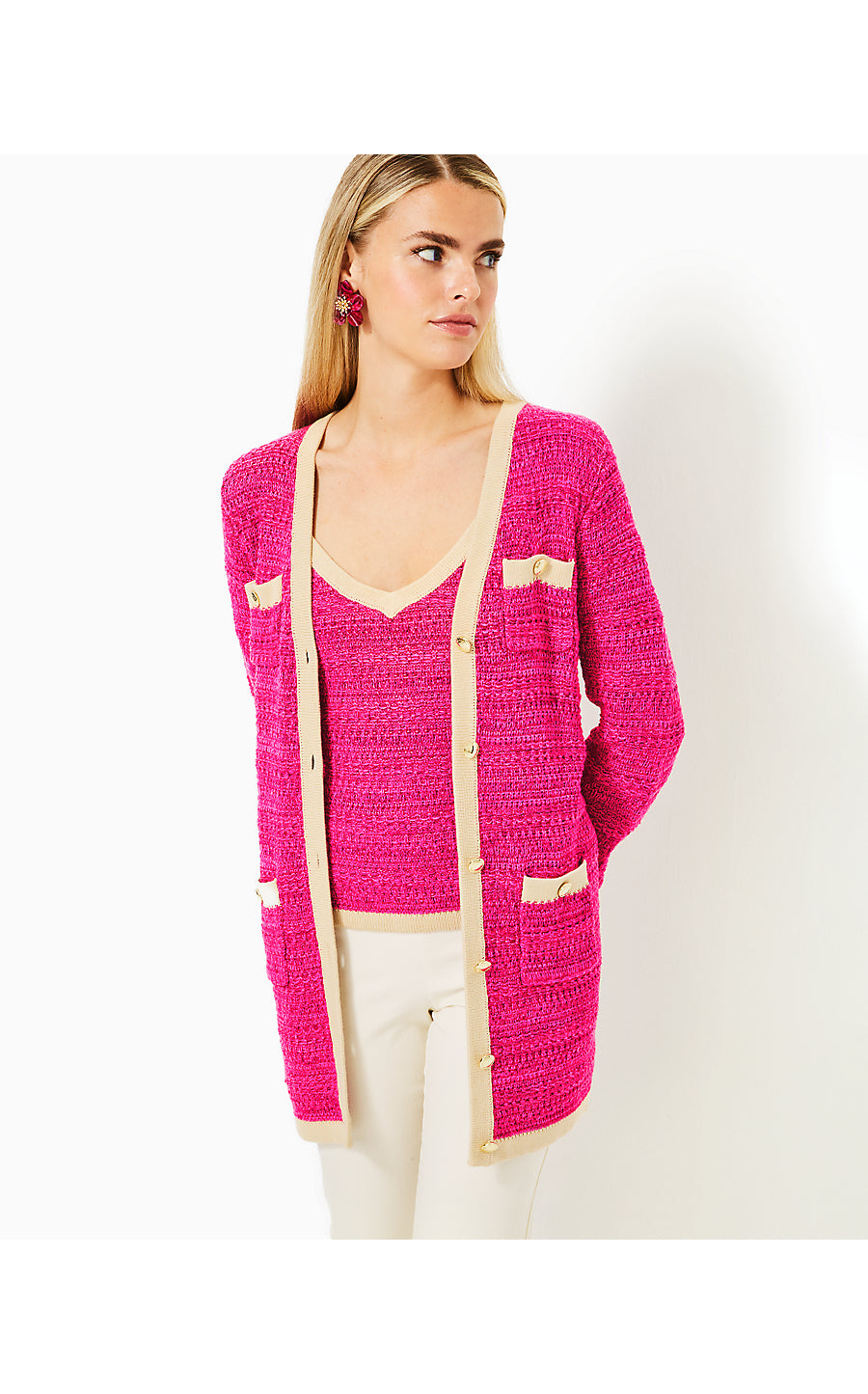 - Sweater set with a long sleeve cardigan and fitted tank. Cardigan features buttons at the center front placket, patch pockets, contrast trims, and allover texture stitch.