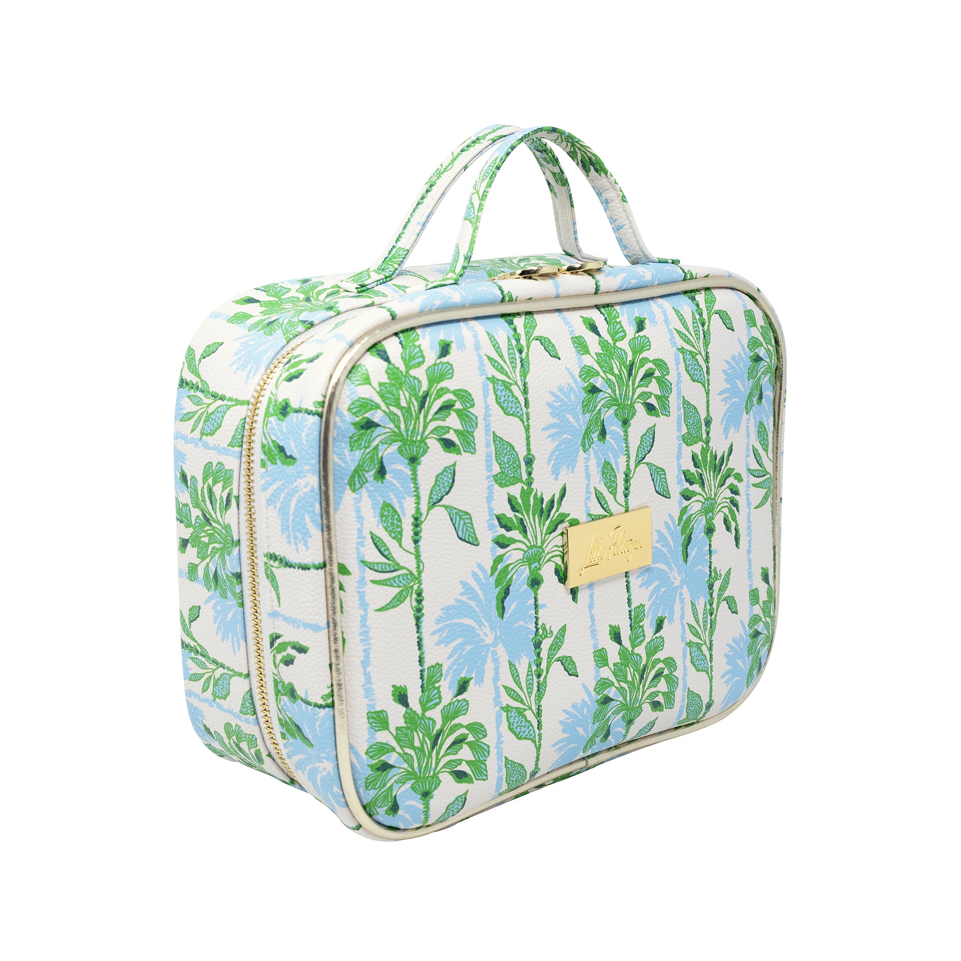 Keep your essentials organized in style with this travel toiletry case. This travel bag organizer features a carrying handle, 3 separate cosmetic bags nested inside, strong gold zippers, and a gold interior with a zip pocket. The Swayin in the Breeze patterned exterior pairs perfectly with the cosmetic bags tucked inside. The travel bag is finished off with a gold plaque logo and a zipper that will hold up trip after trip.