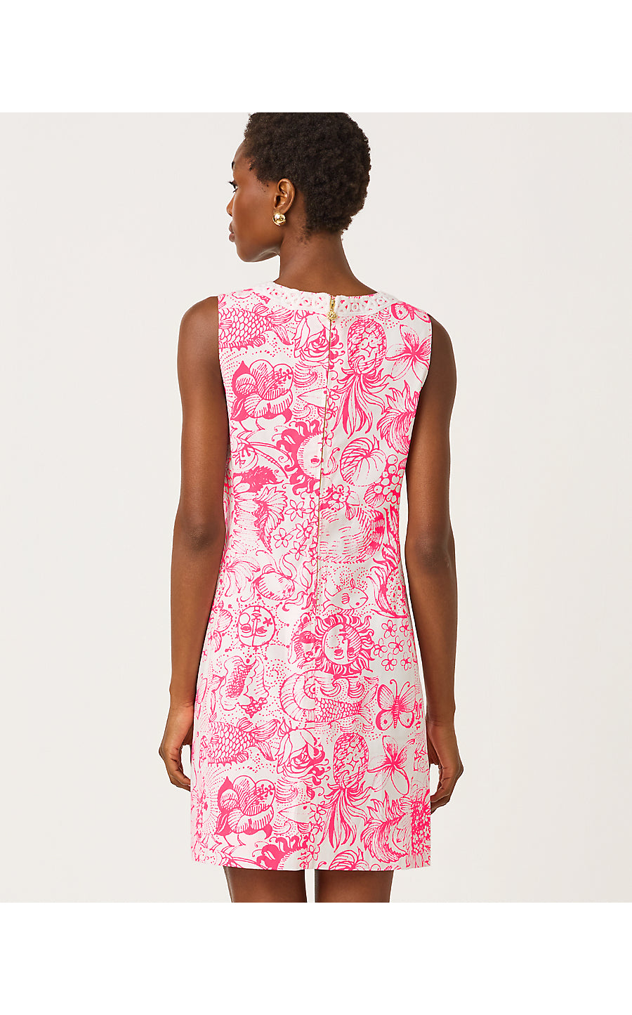 - Straight fit shift dress with side panels, Lilly lace trim, and gold buttons.
